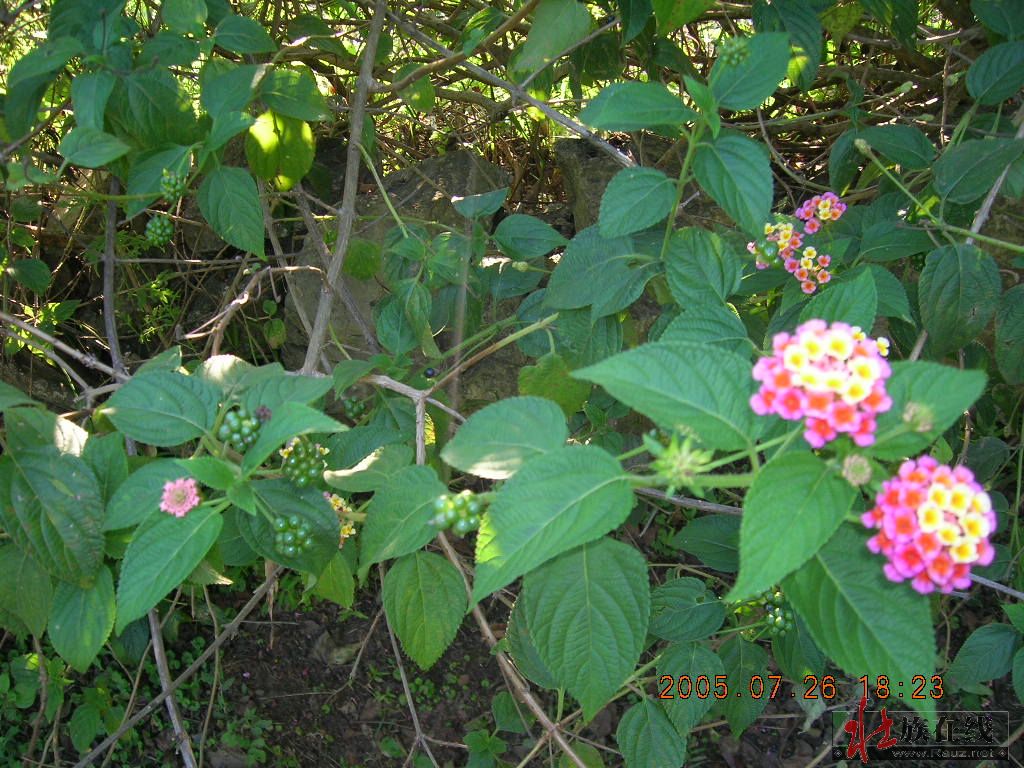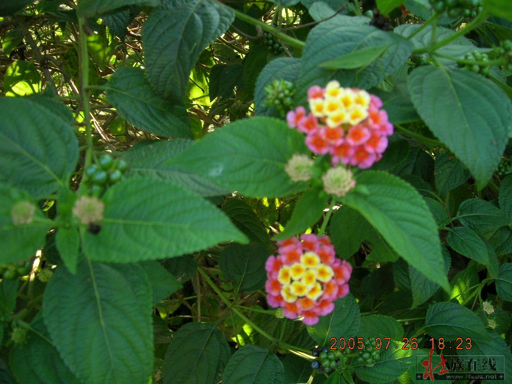 五色梅别名马缨丹、三星梅,为马鞭草科、马缨丹属常绿小灌木。枝条稠密而细弱,常向下呈半藤本状。株高1米左右。老枝暗褐色,嫩枝四棱形,布满细小的毛刺,节部较细,分枝对生。叶对生,卵形、暗绿色,如遇低温即变成褐色。叶缘有齿,叶面粗糙,叶背疏生柔毛。全株有一种特殊的气味。头状花序顶生或腋生,直径约3 厘米,具总梗。其上簇生多数小花,花色丰富多变,初开时为黄色、杏黄色和粉红色,后期变成橘红和鲜红色,中间还夹杂有蓝色。小浆果蓝黑色,成熟后有光泽。夏季开花繁盛,秋季结实。变种有橙红五色梅,外轮花黄色转枯黄或砖红色,内轮花由黄转枯黄色。杂种五色梅,花黄色。黄花五色梅,花黄色转橙黄色。白花五色梅,花白色。