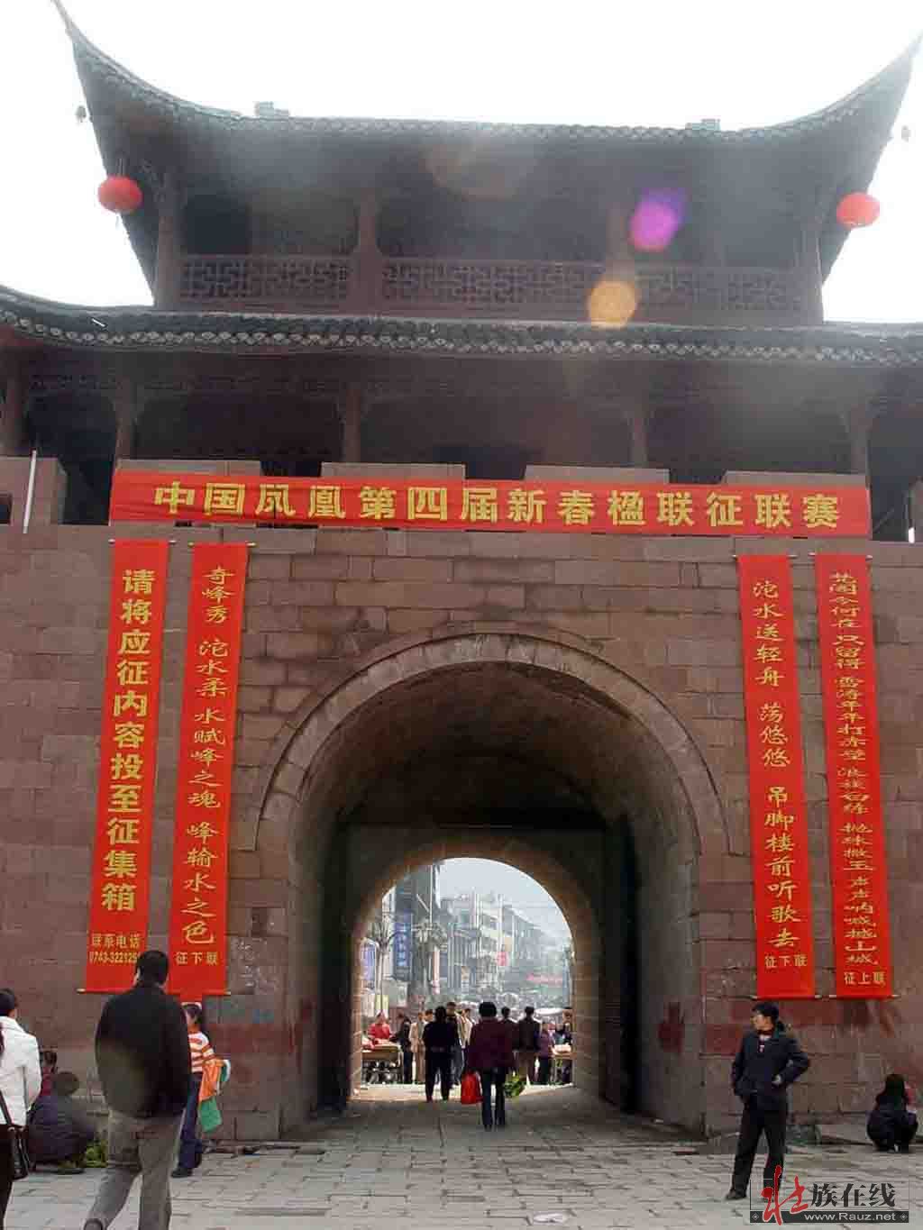 走在去娘家的路上,满街都是鞭炮爆炸后的碎纸屑,象雪片样铺满人行道。路上行人稀少,连出租车也停开,商铺早早地也关了门,街道安静地出奇。中国人,大概只有这时候,才是真正的归家了吧?我后悔没带相机出来,拍下这难得的静静的街景。转过城门,进入还在修建中的沈从文广场,看到城门下有个大大的广告牌立着,上面写有政府部门安排的有关春节活动的各种事项,从大年初一直到大年初七,罗列不少。古城门楼上,挂了长长的一条对联,在征上联。下联是“梵阁何在 只留得 雪涛年年打赤壁 浪旋白练 抛珠撤玉 声声呐喊撼山城 ”。梵阁,我知道凤凰八大景中之一有“梵阁回涛”一景,前面不远就是听涛山,而从文墓地就在那沱江边的听涛山上。而对于对联,我不是很在行,想到论坛的紫薇星或是宇宙微尘等,对对联之热爱。而我只有看着那“沱水送舟 荡悠悠 吊脚楼前听歌去”的征下联的对子,苦笑一下。再看“青峰秀 沱水柔 水赋峰之魂 峰输水之色”,真有阿里山的姑娘美如水阿里山的少年壮如山之绿水情山两厢悦之意。征联,是凤凰春节习俗之一,还的对联,如一篇文章耐读。记得来自西藏的梅朵,到了凤凰过大年,其兴趣爱好之一就是挨家挨户去抄写那门上的对联,看看写的最绝妙的是啥,而人行宝庆论坛的朋友到了凤凰,也把抄写凤凰最有特色之对联作为一大比赛项目。而我,可惜走的太匆忙了点,没有细看那些商家店家百姓人家的门上,写的是什么,倒是有不少外地游客在对着那征联拍照。也有不少游客,就着城墙在合影。