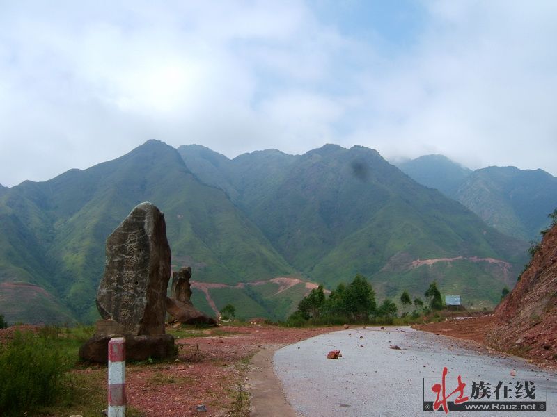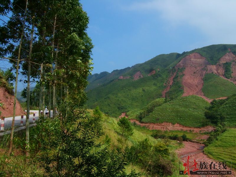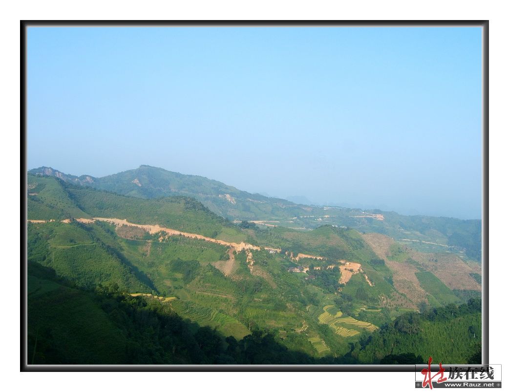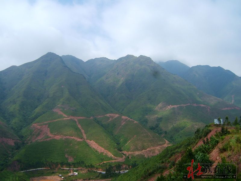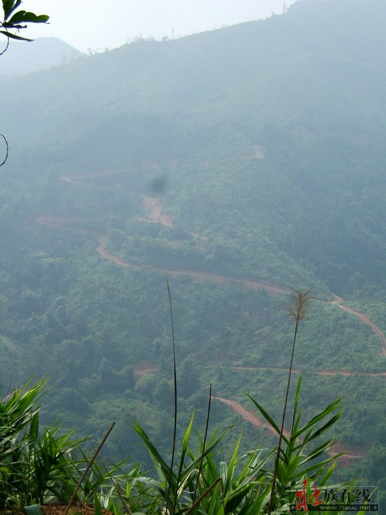 从那涯村沿着小河又走了2KM,到了板八乡江口村路口(70公里标),住左为至峒中的沿边路。再走2KM到那蒙村,过去又是一个极陡的坡。到这个时候,中午腐败的饭菜早已经不知跑哪去了,两个人只好又分吃了一块巧克力,小息片刻继续爬坡。此坡长约3KM,至76公里标到尚义村,再走两公里平路开始下坡,到了坡底,又是一条界河。因为几天前的黑格尔台风造成的暴雨,河对岸越南境内的一座高山上从半山处塌下了一条长长的泥石流,听当地人说,泥石流下压着一家房屋,死了三个人。