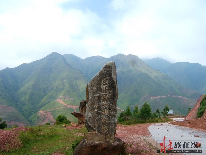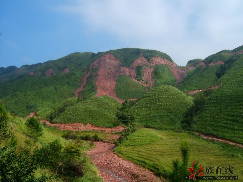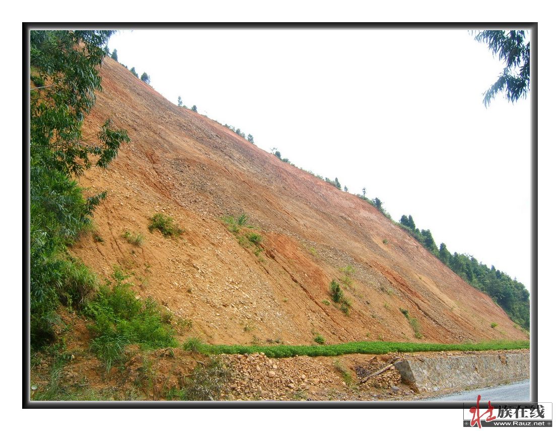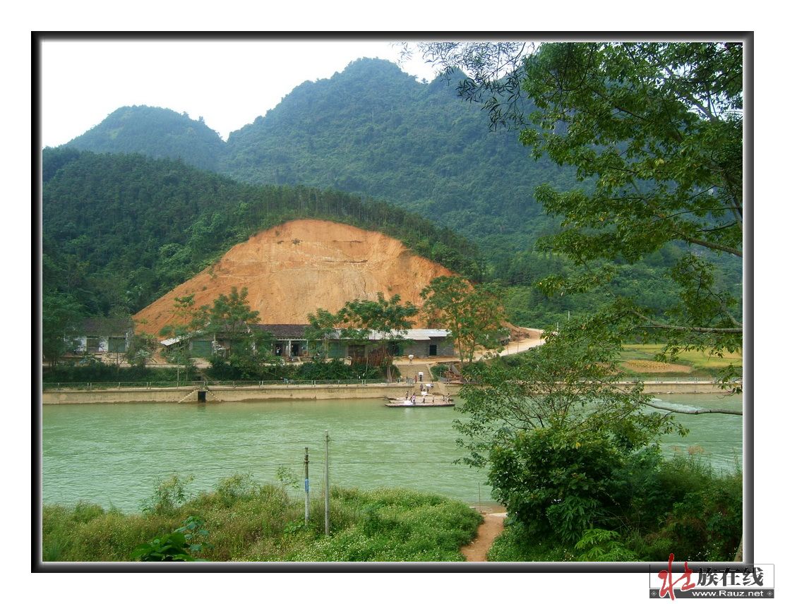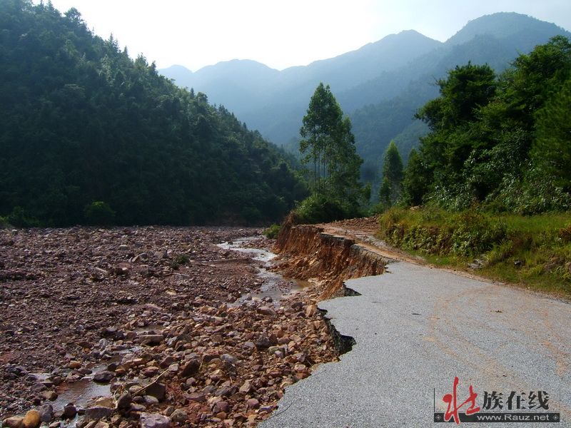 从那涯村沿着小河又走了2KM,到了板八乡江口村路口(70公里标),住左为至峒中的沿边路。再走2KM到那蒙村,过去又是一个极陡的坡。到这个时候,中午腐败的饭菜早已经不知跑哪去了,两个人只好又分吃了一块巧克力,小息片刻继续爬坡。此坡长约3KM,至76公里标到尚义村,再走两公里平路开始下坡,到了坡底,又是一条界河。因为几天前的黑格尔台风造成的暴雨,河对岸越南境内的一座高山上从半山处塌下了一条长长的泥石流,听当地人说,泥石流下压着一家房屋,死了三个人。