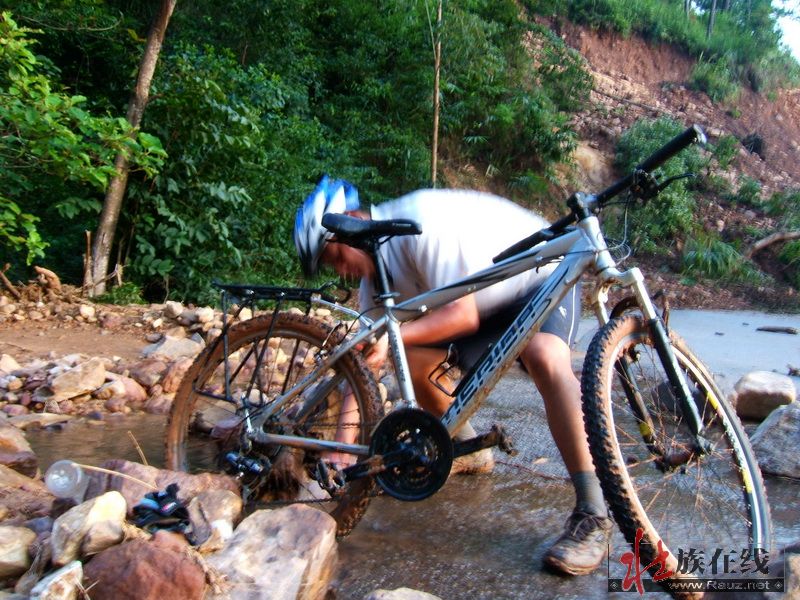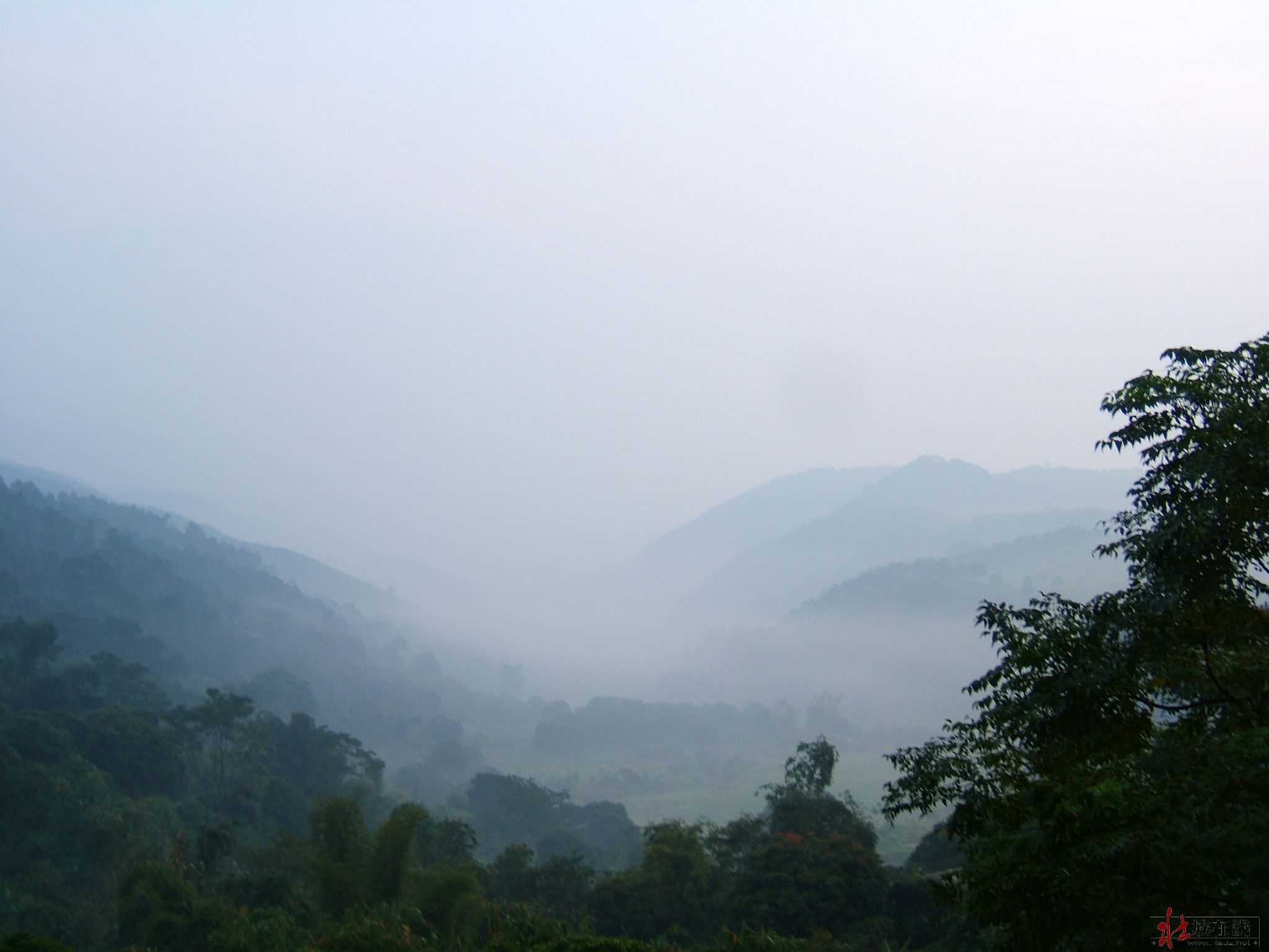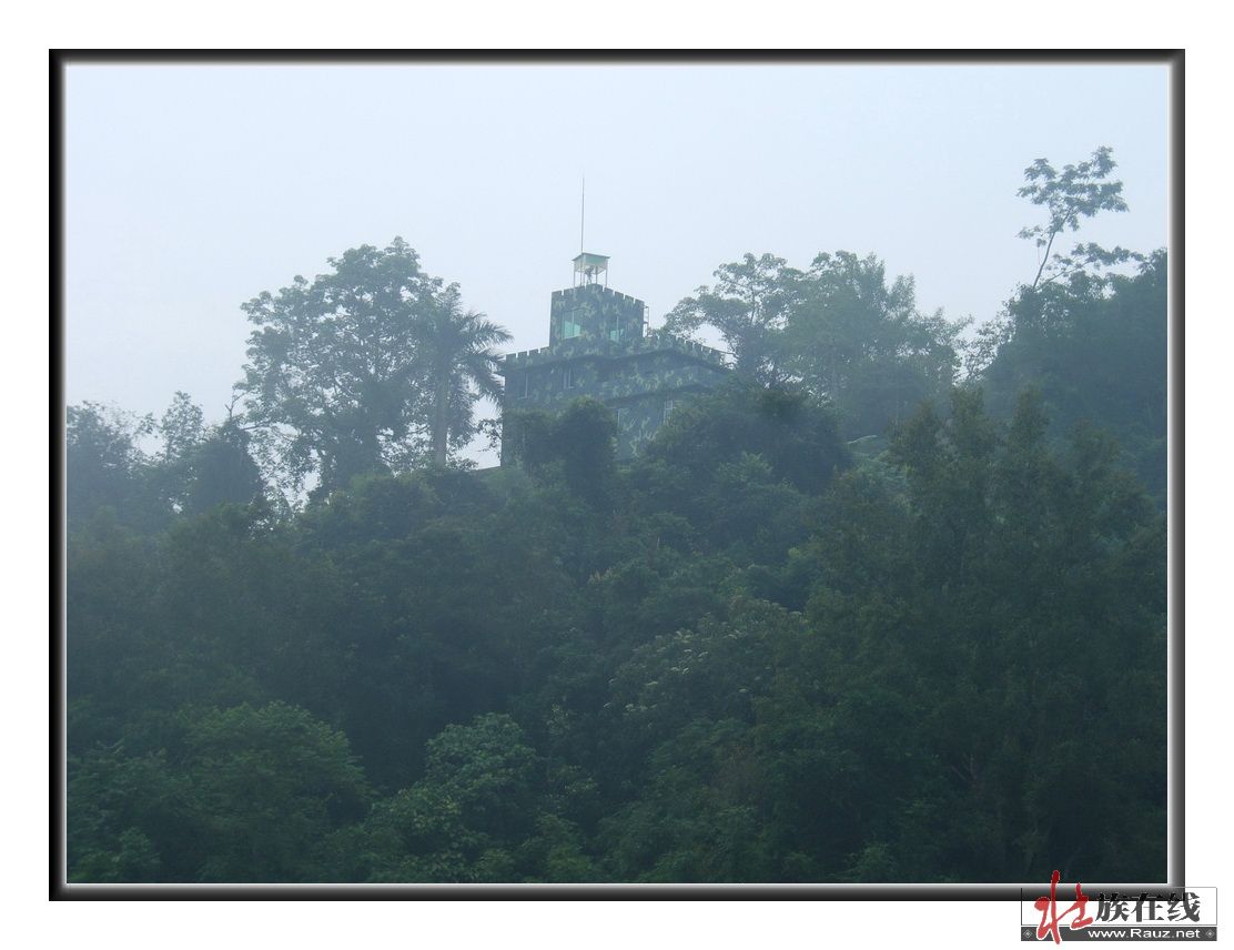 从里火出发开始爬坡。开始的4公里比较缓,沿着边界的小河走,河的另一边即是越南。这里的边民过境就像吃饭一样平常,在潵摊村(沿边路42公里标,不是潵摊边贸点,潵摊边贸点离沿边路还有3公里)的路边,我们就看见一个妇女背着个小孩过了界河。到52公里标的桃花溪景区,坡开始陡了起来,连续8公里都是陡坡路,一直到60公里标的山顶。路上,山溪一直伴着我们上到顶坡,因为刚下过一场暴雨,溪水很充沛。以前很少骑那么长而陡的坡,没什么经验,用2-4、2-3档慢悠悠的爬,非常吃力(一直骑到第三天才知道用1-2、3档上坡,真是囧死人了)。骑到58公里处时,担心的事终于来了,天开始下起雨来。昨天晚上刚好翻北风,气温下降了不少,很适宜骑行,但出门的时候天就阴沉沉的,现在到了山区,雨终于还是下起来了。路上无处可躲,只有冒雨爬坡。没多久到了59公里处马鞍坳标志台(海拔682米),几对男男女女在这里谈人生谈理想,更绝的是还有一帮人在烧烤。雨越下越大,相机也湿了,弄得镜头灰蒙蒙的,加上光线又暗,照不出什么相片来。没在标志台多作停留,直接上到60公里标处的山顶,这时雨已经把衣服淋湿透了,顶着大雨骑下连续6公里长的坡,感觉又冷又饿。