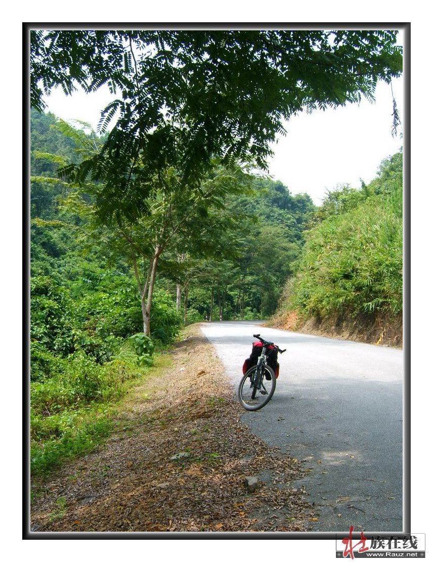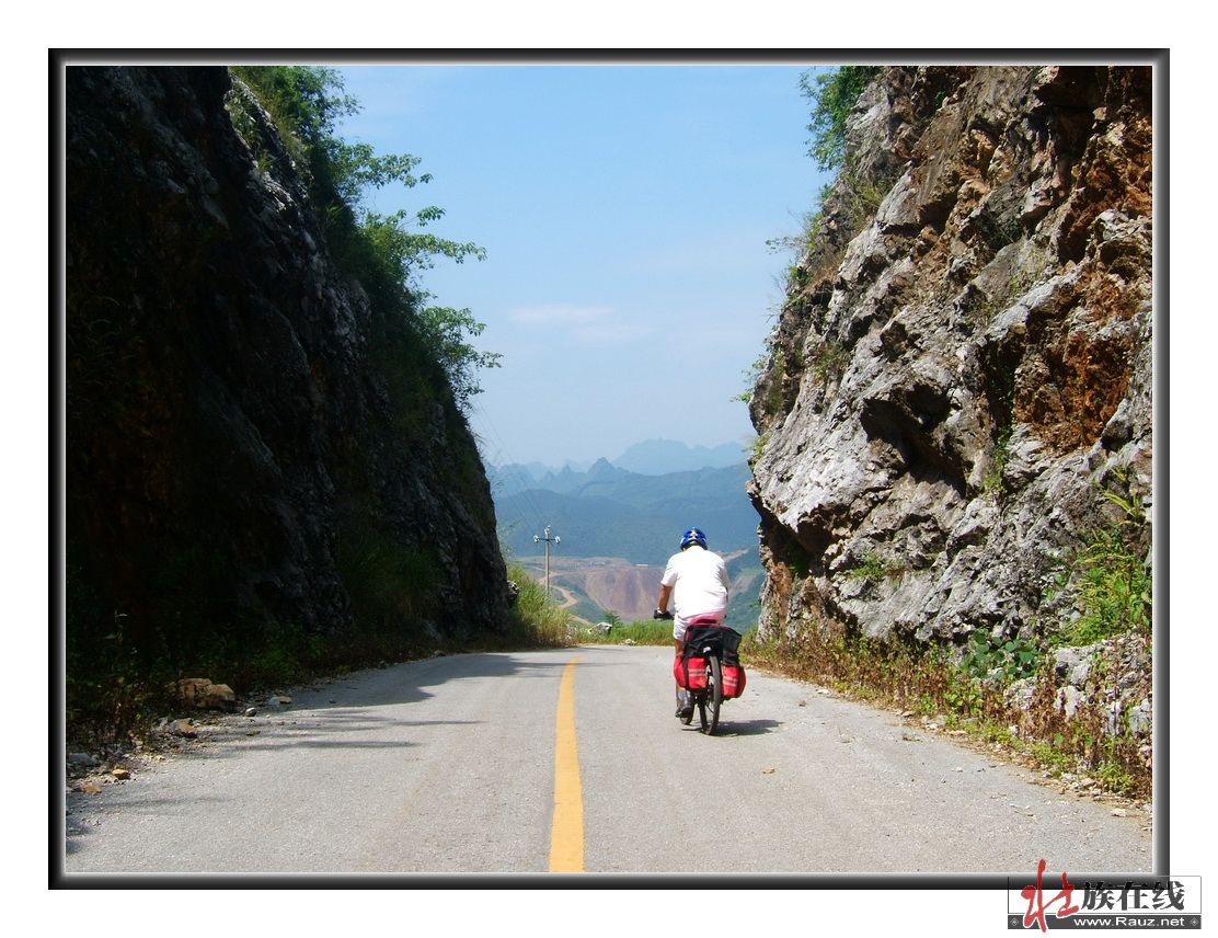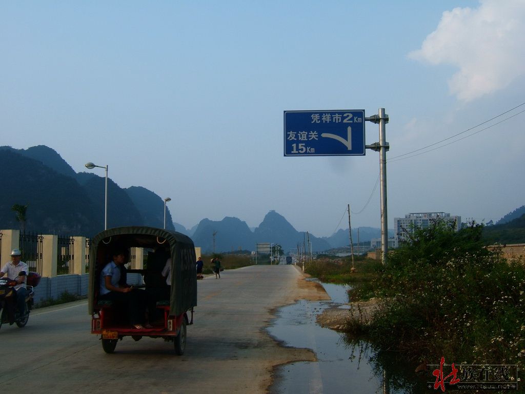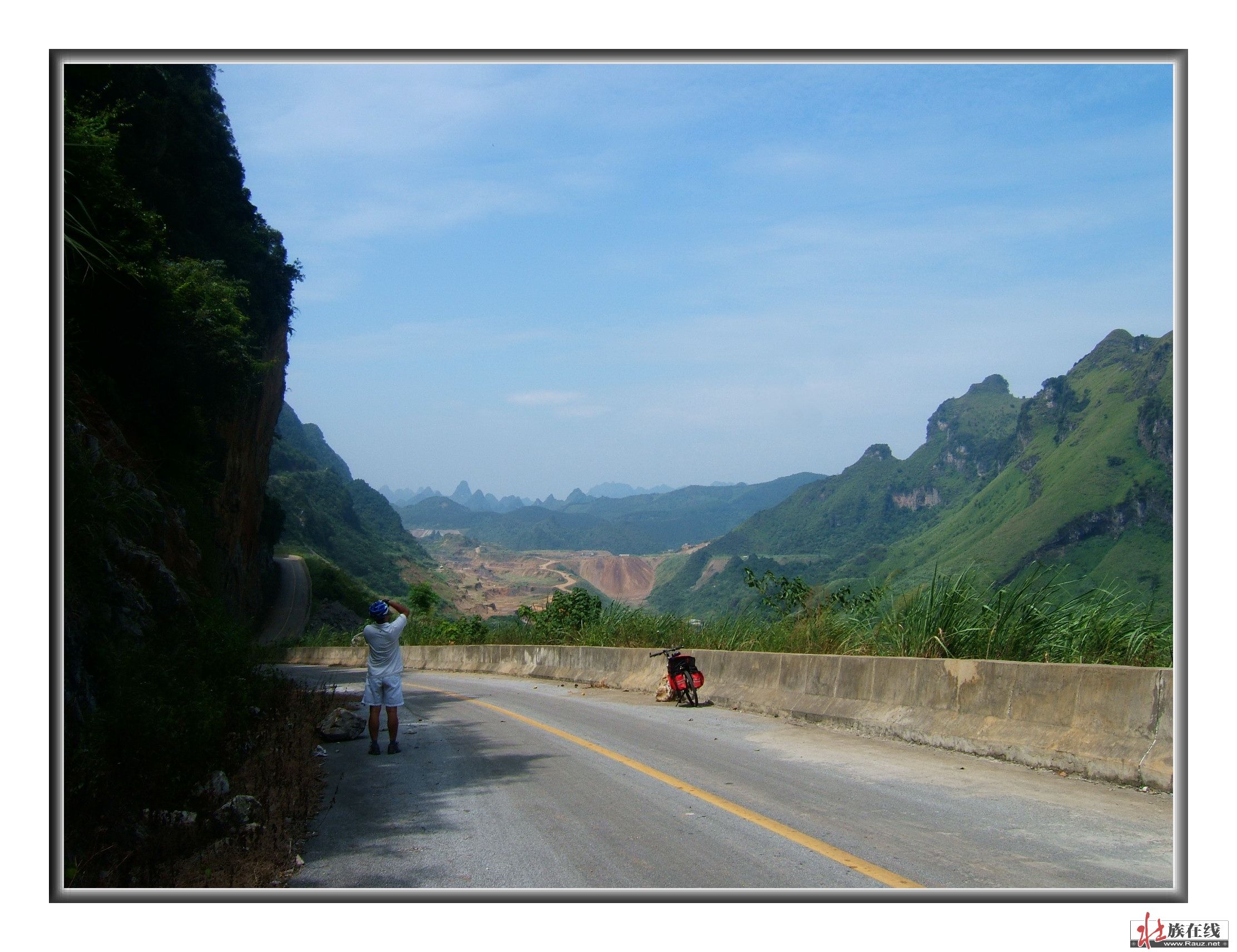 从岳圩到龙邦口岸基本都是平路,仅在近龙邦 一段有上坡路段。出岳圩没多远是壬庄(15km)化峒(10km)路口,至518公里标为壬庄水电站,530公里标为壬庄乡。壬庄乡更小,连住宿的旅社都没有。在壬庄休息片刻,吃点水果继续上路。出壬庄3公里开始上鬼哭坳。鬼哭坳名字很吓人,但其实坡并不难爬,坡长5.7公里,坡度较缓。其时正是夕阳西下,太阳的位置比我们还略低,余辉把悬崖边上长长的栏杆和我们拉长的身影映在公路上,折上崖壁,真是有无限的诗意。可惜,关键时刻相机又没电,而且,忙着骑车,竟然没看到“鬼哭坳”那个标识。下了鬼哭坳没多久天便全黑了下来,打着电筒骑了半多个钟头,终于在晚7:30分左右到达龙邦口岸。