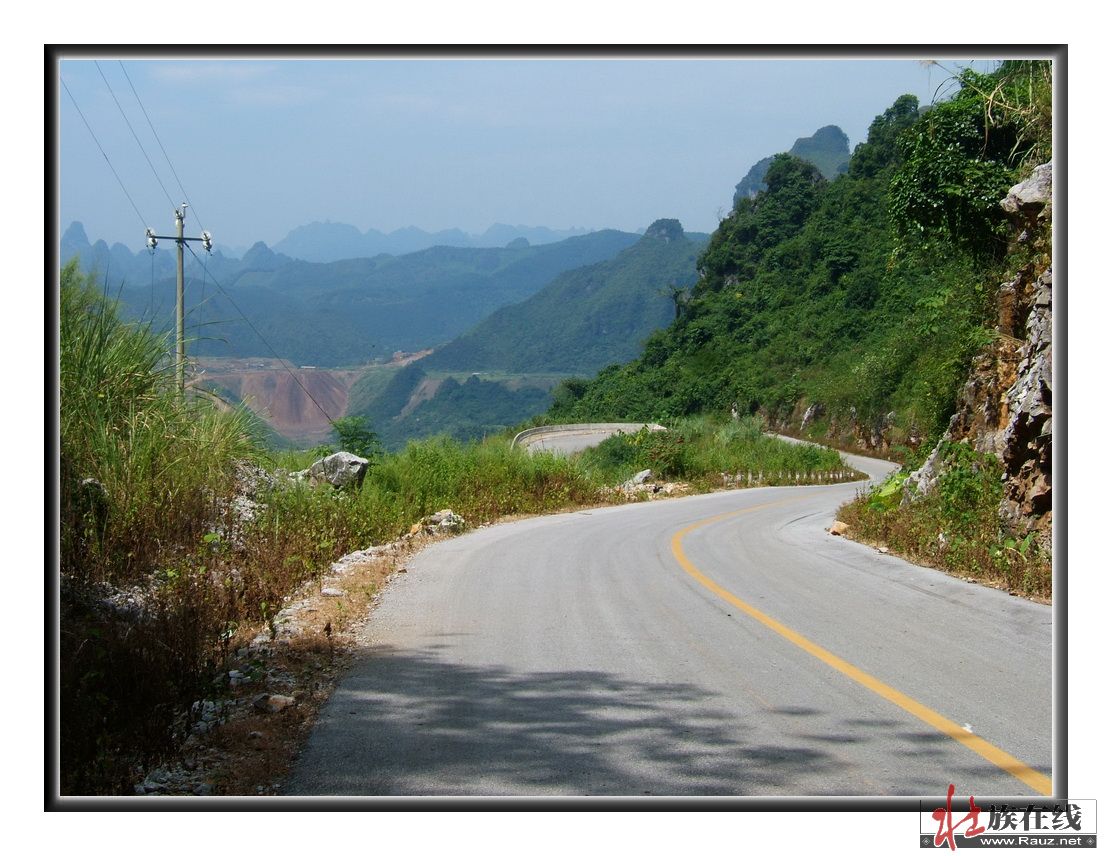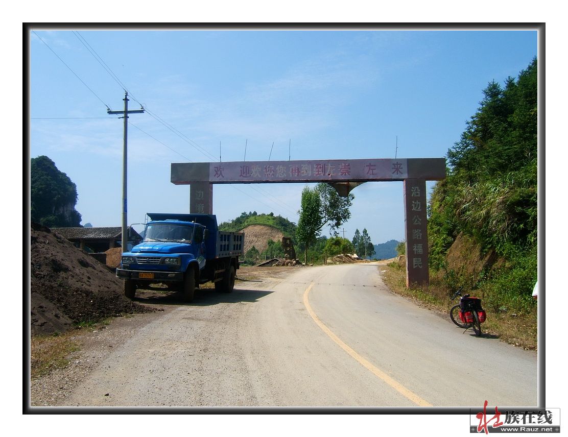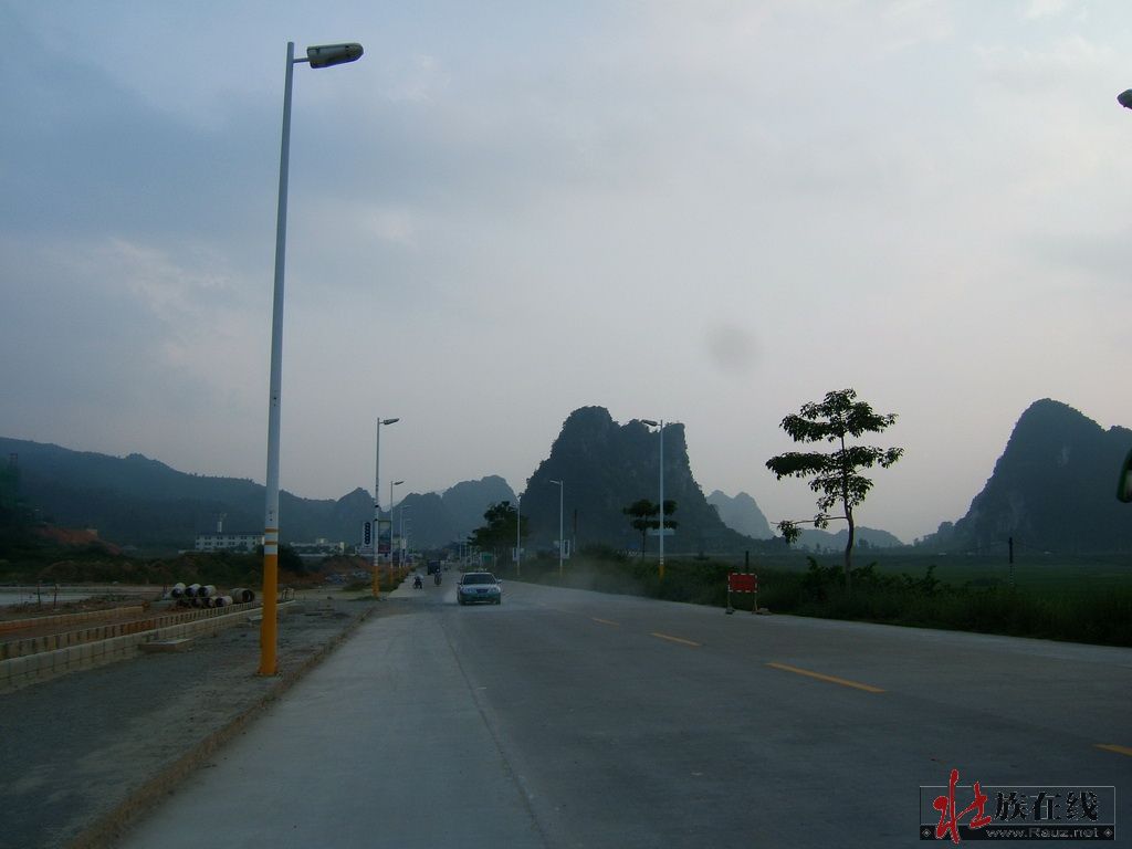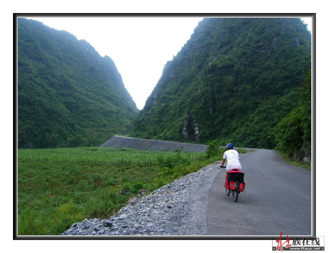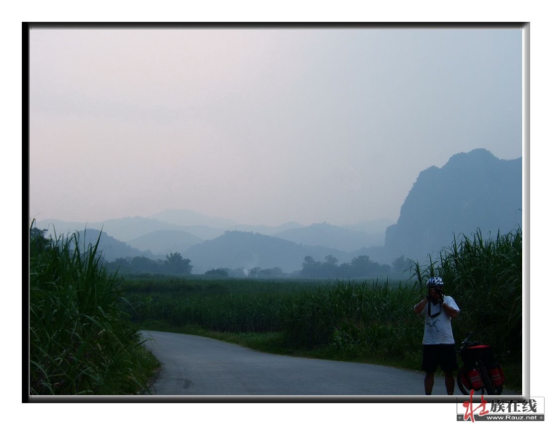 从岳圩到龙邦口岸基本都是平路,仅在近龙邦 一段有上坡路段。出岳圩没多远是壬庄(15km)化峒(10km)路口,至518公里标为壬庄水电站,530公里标为壬庄乡。壬庄乡更小,连住宿的旅社都没有。在壬庄休息片刻,吃点水果继续上路。出壬庄3公里开始上鬼哭坳。鬼哭坳名字很吓人,但其实坡并不难爬,坡长5.7公里,坡度较缓。其时正是夕阳西下,太阳的位置比我们还略低,余辉把悬崖边上长长的栏杆和我们拉长的身影映在公路上,折上崖壁,真是有无限的诗意。可惜,关键时刻相机又没电,而且,忙着骑车,竟然没看到“鬼哭坳”那个标识。下了鬼哭坳没多久天便全黑了下来,打着电筒骑了半多个钟头,终于在晚7:30分左右到达龙邦口岸。