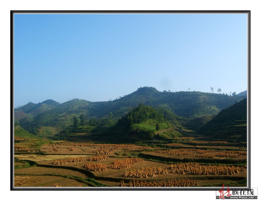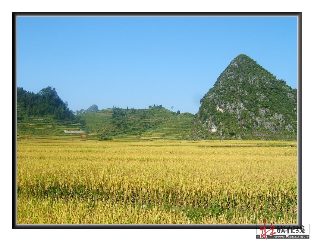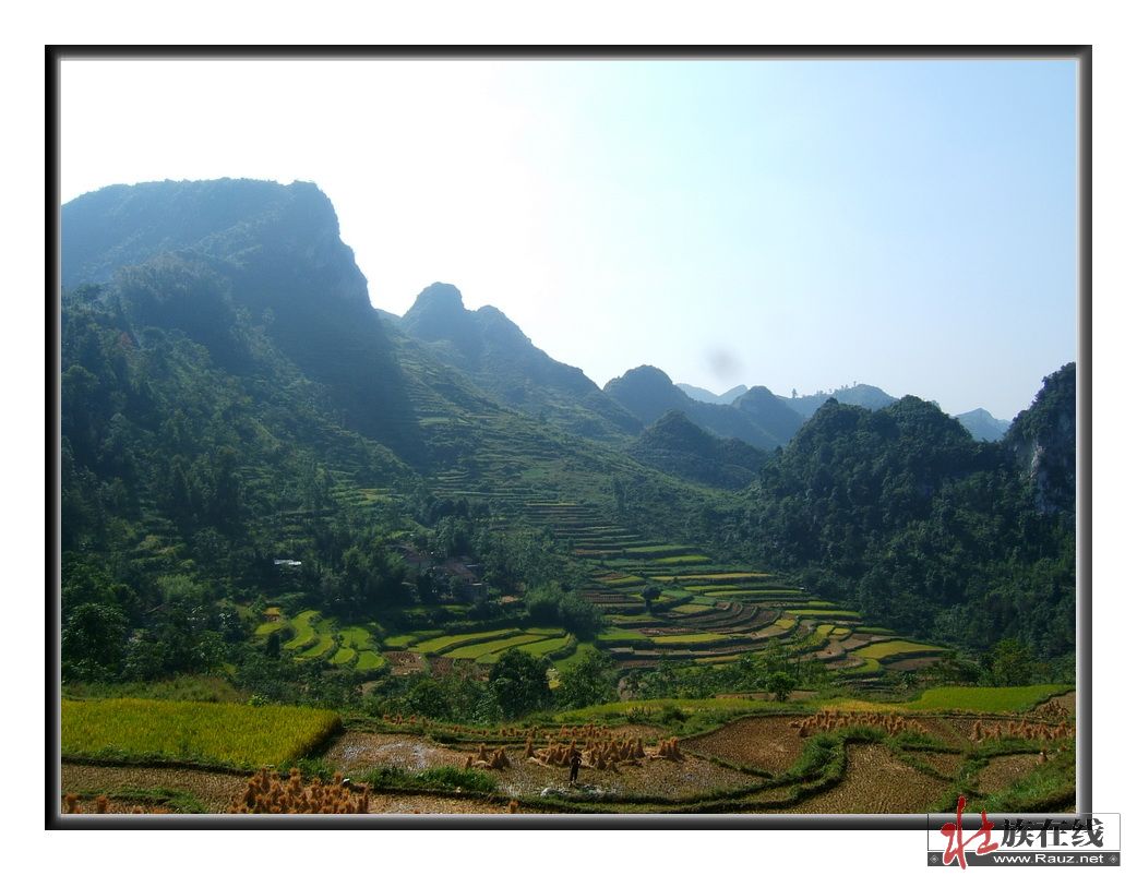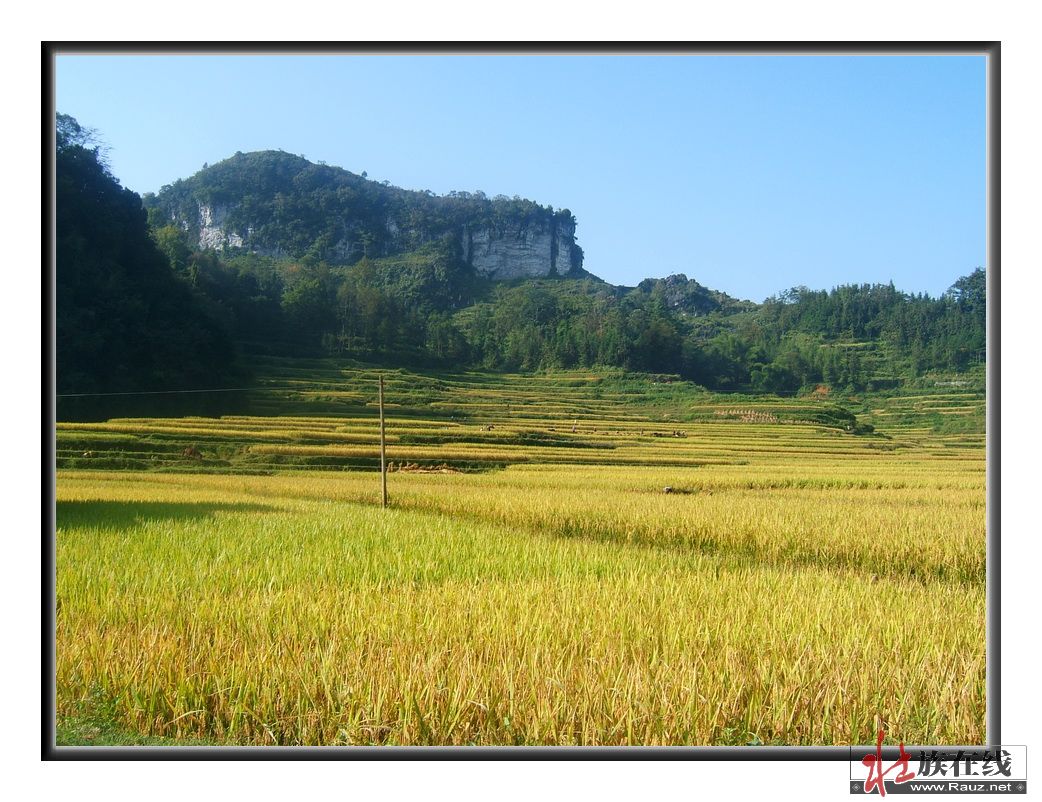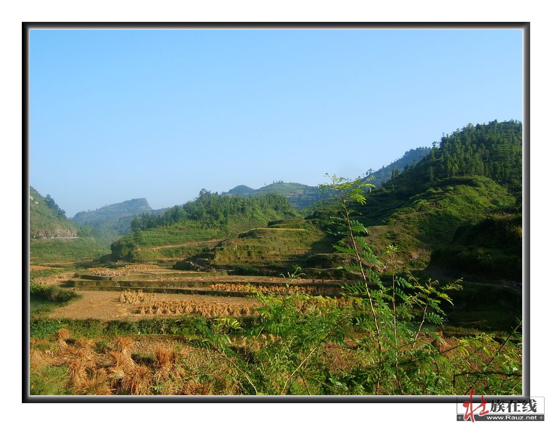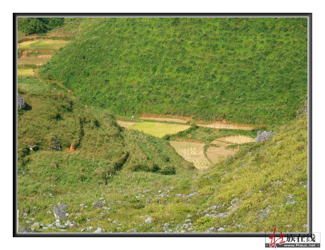 大石山区的“天路”。摄于果布村背的半山,没想到这么高的地方竟然也有水田,再过去一点,还有一个引水池。从沿河一路上来,虽说是一路平川,但海拔却在不知不觉中升高。前面的路段,晚稻都已经收割完毕;在中段,大部分稻田正在收割中;到了果布村,大部分稻谷已经黄透,但收割刚刚开始。而到了果布村背半坡的山上,这里的稻田才刚刚成熟。