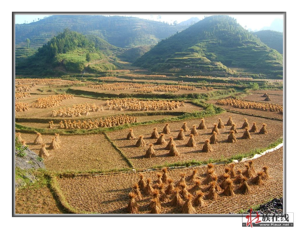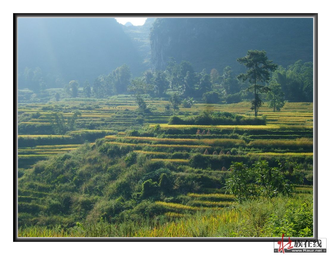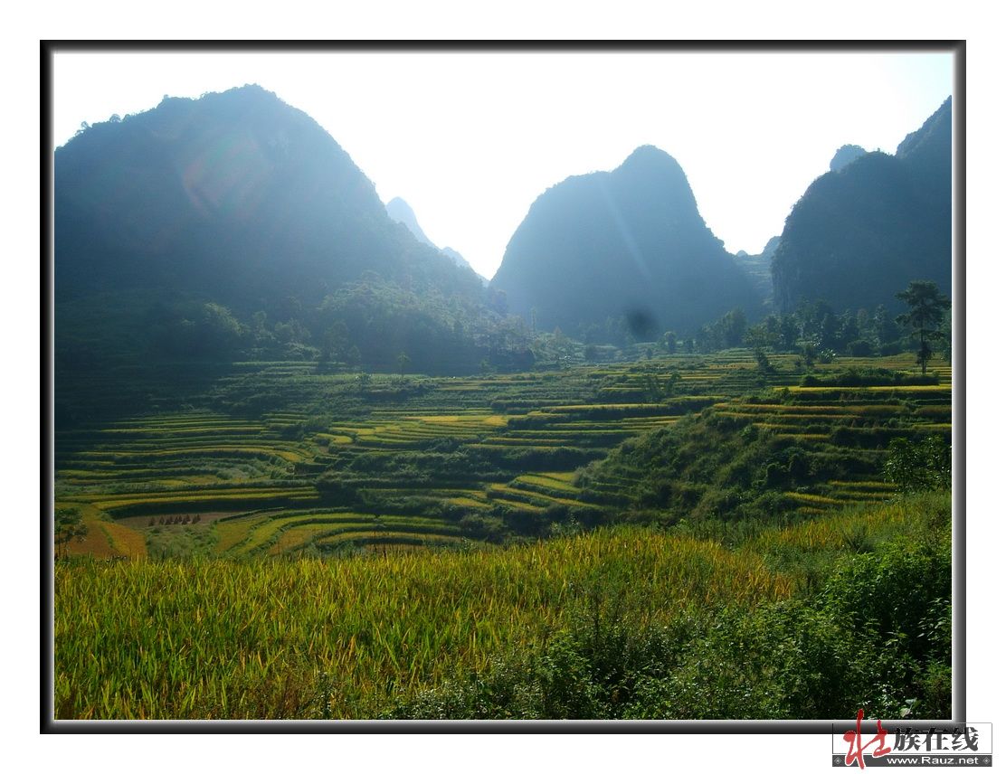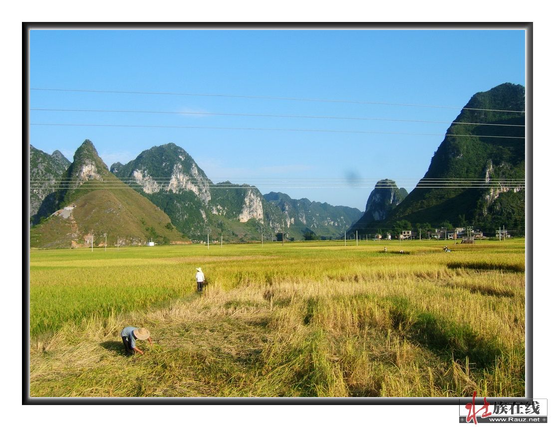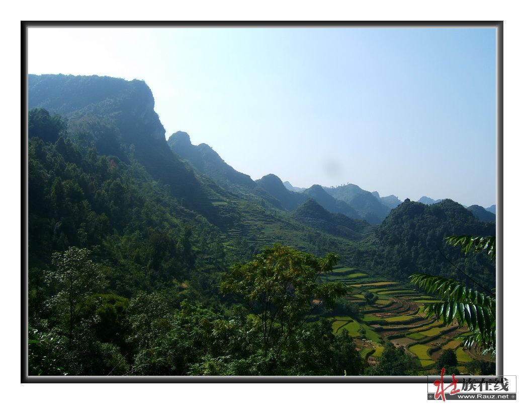 大石山区的“天路”。摄于果布村背的半山,没想到这么高的地方竟然也有水田,再过去一点,还有一个引水池。从沿河一路上来,虽说是一路平川,但海拔却在不知不觉中升高。前面的路段,晚稻都已经收割完毕;在中段,大部分稻田正在收割中;到了果布村,大部分稻谷已经黄透,但收割刚刚开始。而到了果布村背半坡的山上,这里的稻田才刚刚成熟。