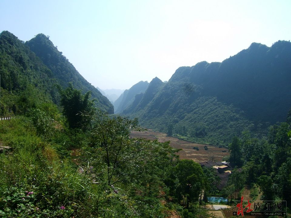 从尚义下坡到板兴村,再上一个小坡,经过一个塌方,再下一个长坡即到峒中镇。在峒中前遇见四个从广东骑摩托到广西旅游的车手,四人两车,看来国庆假出游的人还真不少。下午5点,终于到达了峒中镇。
