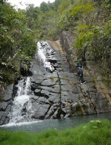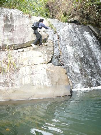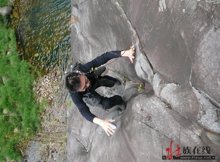 雷峡谷在村子的左侧,属于那雷屯领地的峡谷拥有三个瀑布,一个比一个高一个比一个险,我们一路是为追寻瀑布而前进的。那雷峡谷的特点是:峡险、水清、石怪、草绿、瀑奇。深山里直接淌出来的水,让你不觉想掬起送嘴里或跳水里泡个澡。溪水边到处生长着“绿得逼人眼”、叶子象松毛的未名草。瀑布永远是每个峡谷最令人赞叹的风景,那雷峡谷的三个瀑步第一个轻盈跳跃;第二个直垂泄而下;第三个瀑布则为两级,约二十多米高。我们其中的几个强人蝶姬、伊龙、阿光居然敢攀上去,阿光还在瀑布上来了个标准的瑜伽动作。峡谷里乱石堆彻,有些石头有着天然的脚印,我们美其名约:“仙人印”;有一块石头上居然有一个惟妙惟俏的巨大唇印,呵呵看来又是哪位仙女留下的情痕,加上前面的脚印可以串成一个美丽的传说了。峡谷中一段长约50米的石壁最为壮观。石壁为完整巨石,壁底鬼斧神工般笔直,我们得小心翼翼蜘蛛侠般贴着石壁前行,还好石壁上生长着结实的树根,很多时候我们得依靠这些树根在峡谷中前行,真是惊险刺激,这就是峡谷游的最大魅力了。好户外游的香草注意到峡谷里很合作地有两块天然的草坪,非常适合在扎帐。如果另一个屯的峡谷连接起来,那是太适合作穿越了。