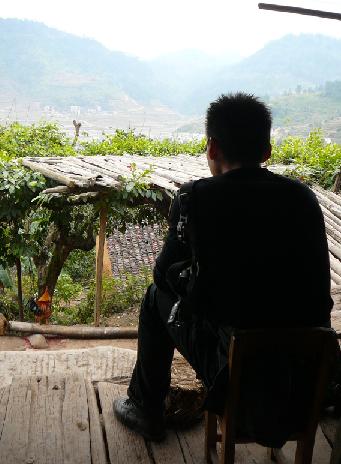 从峡谷出来后,我们和那雷屯来了个亲密接触。对那雷的第一感觉是:“恍如隔世”,杆栏、土墙、石柱、晒台,细脚鸡、花头鸭、僚音,童年的很多回忆在夕阳的土墙上暖暖地升起了。最吸引大家的是晒台吧,由于寨子依山而建,聪明的那雷人就地取材,巧妙地把晒台搭建在榕树顶上,把僚人一贯的天人合一观念发挥到了极致。作为壮族宗教的研究人员,香草则把注意力放在当地的神龛、庙宇,还有那块极具文物意义的写有“吞魔恶邪”四个土俗字的巨石。巨石立在干栏的楼梯边,尽管香草还不能完全断定到它的实际意义,但可以肯定的是,这里的麽文化曾经非常盛行。懒阳阳地在晒台上聊天,吃上主家给我们的香香的年后,香草打消了今天回南宁的决定,看来是那雷是个很好的留客地。明天和红树树等到靖西县参加飘渺乐队的演唱会,相信精彩还会继续。