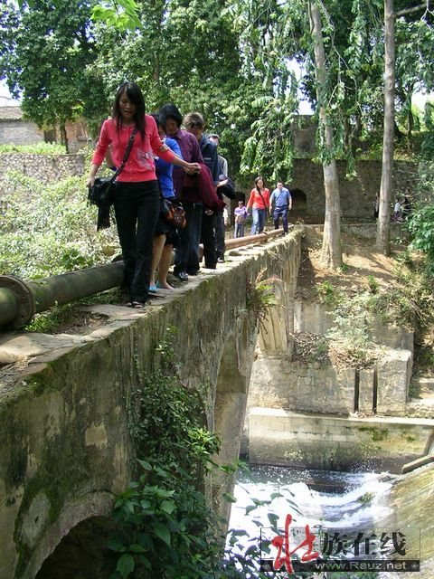 冒险走过小桥的游客们