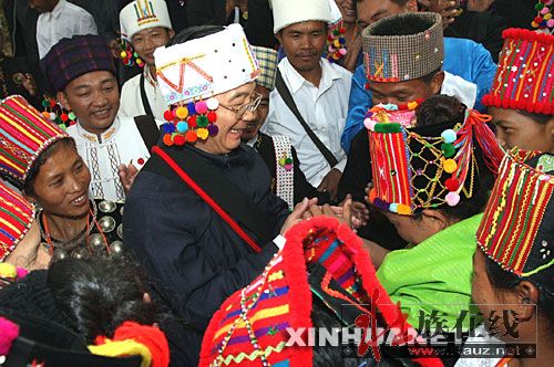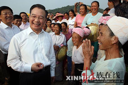 3月31日至4月1日,中共中央政治局常委、国务院总理温家宝在云南省德宏傣族景颇族自治州先后考察走访了傣族、景颇族、德昂族三个少数民族村寨。这是4月1日,温家宝在景颇族村看望景颇族群众。 新华社记者姚大伟摄