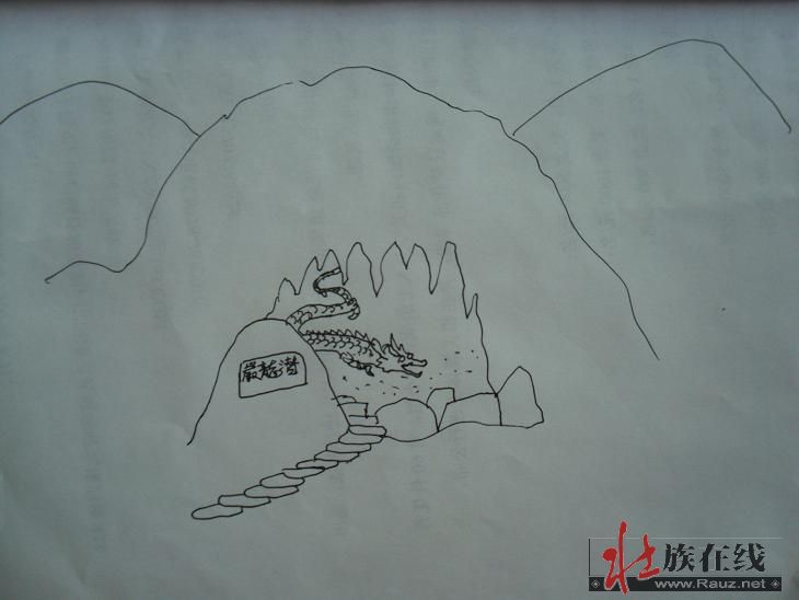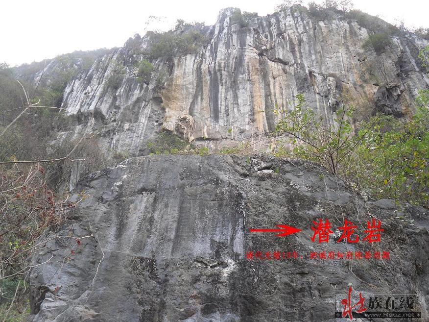 第2天中午吃完午饭,3个伙伴集中在一起,我、鼻涕(外号)、马急(外号)就一起出发,以前要进潜龙洞,要经过县酒厂,然后才能上山。远眺,潜龙巌那片悬崖隐约像一只狮子大开口,隐隐看见黑漆漆的洞口,沿着石路走上去,温度不断降低,山坡上零零星星的有一些古墓,让人不时打冷颤。路上杂草灌木丛生,我走在前,用柴刀开路,鼻涕和马急在后面紧跟,好不容易走到一块大石头旁,停下喝口水,马急这时指着我们身后的大石头说,看上面有字,好象是什么“景阳岗”的?我抬头看了看,大石头上果然有字,揉揉眼睛仔细看,见石头上有三个大字:“潜龙巌(岩)”,旁边写着:“光绪10年泗城府知府陈善均题”我说景阳岗有老虎,这里不会有龙吧?鼻涕吓得脸发青,说不敢进去,我说怕什么,比我们大那几个家伙都进去了,我们怕什么,说完,我就给鼻涕和马急每人砍了跟棍子防身,要是龙出来了,或许也能打一下。