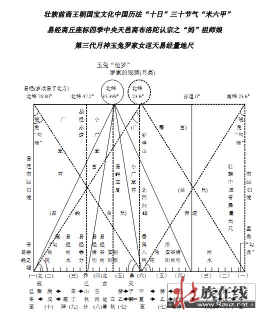 最后吁请大家再看一看下图所示的——壮族前商王朝国宝文化中国历法“十日”三十节气“米六甲”易经商丘座标四季中央天邑商布洛陀认宗之“妈”祖师娘第三代月神玉兔罗家女巡天易经量地尺——感受我们少数民族黎苗子孙的祖先开创的光辉灿烂的中国土著本土文明文化“中国商丘易经文化”的光荣与辉煌吧!