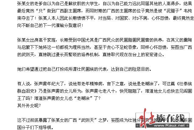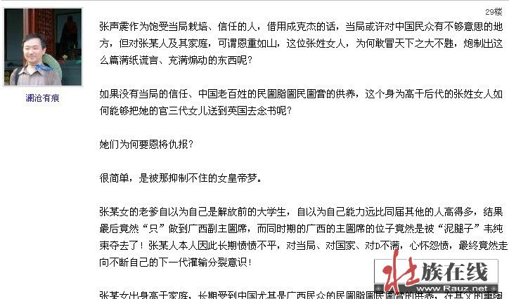 以下是引用土人香草在2011-11-22 12:05:24的发言:总感觉,背后有一股神秘的力量,他们被一些人豢养着,专门从事试图破坏某种格局的事情。他们有一定的组织性,精心了解那些被封为“壮族精英”的各位老师们的一举一动,还有他们的各种背景,然后一步步进行策画,编造各种谎言,试图诋毁壮族在国家中的形象。挑起壮族与其它族群的矛盾,以达到他们的某种目的。