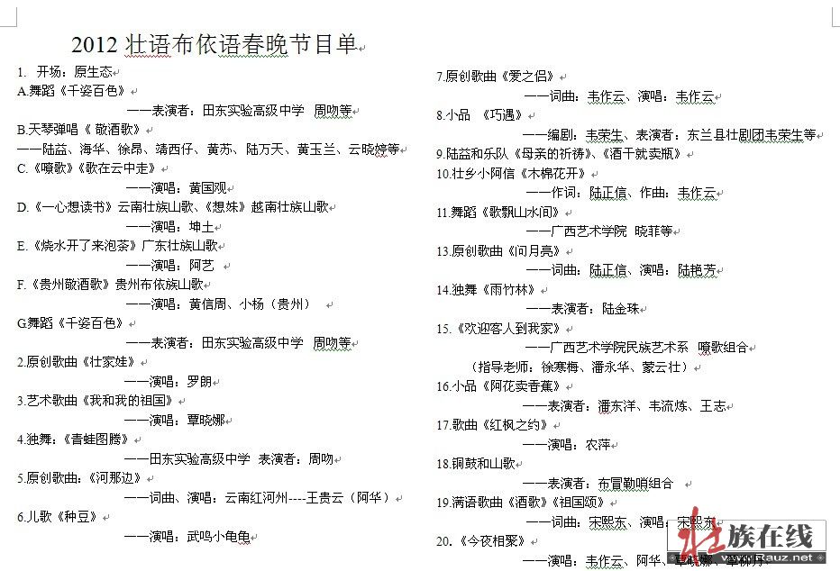 看了晚会照片和节目单,知道了是一出普通的文艺演出,也正常不过。如果演出前组织者在网上公布的是现在的“2012壮语布依语春晚”名称,公开了现在的演出节目单,让事实一目了然,也许就避免了许多的是是非非曲曲折折。一件正常的事情没能正常的办好,甚为遗憾。