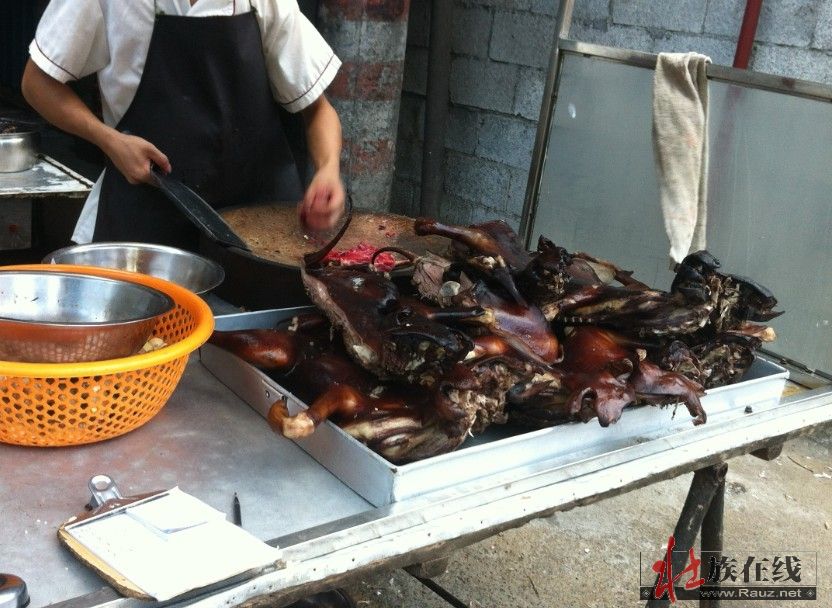 那些狗肉都是没有熟的!!皮子黄色是证明用稻草烧过的,这样才算是稻香狗肉!!白切狗肉不是这个颜色的,没有显这么的黄或者黑。