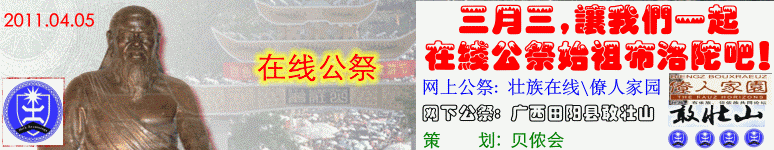 还有两天就到三月三了,作为布洛陀子孙的我们,无法一一到敢壮山去拜祭我们共同的祖公.虽然我们遍布各地,但是,我们的心意不能丢,我们拜祭祖公这种传统不能忘.自从本站2004年举行过一次在线拜祭至今再也没有再办过了.今天,贝侬会全体成员提议并组织各位无法赴敢壮山的所有僚族后裔在此进行拜祭!缅怀先祖之恩德,检讨自我之过失,加强众僚之发展.