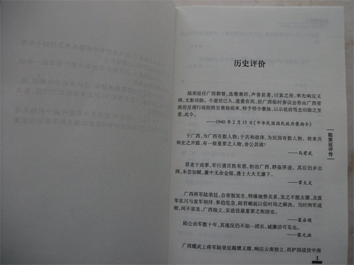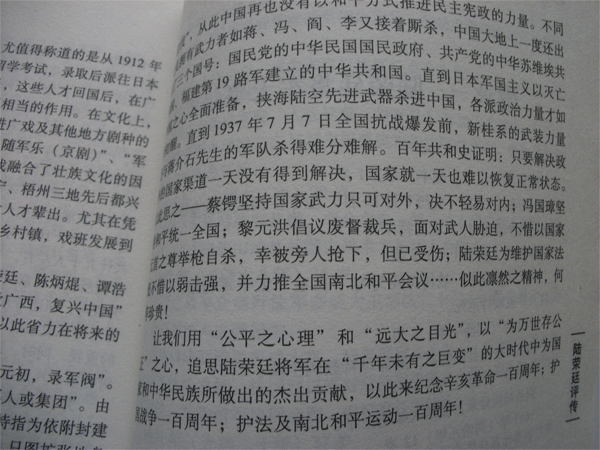 2011年是辛亥革命100周年,“文化大革命”后拨乱反正,我们今天才有机会来重新评价陆荣廷,一个少数民族孤儿能做到在中国帝制复辟的紧要关头做出力挽狂澜的贡献,使中国的民主共和的航船不至于沉没,我们还能要求他怎样呢?又有几个人能够做到的呢?陆荣廷不愧是“再造民国”的英雄!我们有那么多的历史学家,各有精辟的见解,但给陆荣廷一生正确评价这件事,却让刚届不惑之年的梁越完成了,后生可畏!他是需要勇气的。当然,他的一家之言,有争议也是允许的,但在我看来,他的评价对陆荣廷的功过了了分明,给人们打开了一扇新窗。