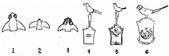 中国考古学发现充分地印证了文献典籍中灵魂鸟、引魂鸟的存在。它的踪迹遍及吴楚以及西南地区。新石器时代的良渚文化即出有玉鸟,或象雀,或似鸽,或如燕(图1至3),多做张翅飞翔的形态。上海福泉山良渚文化基地出上的泥质陶壶上绘有许多“美观”“繁细”的飞舞的禽鸟,形姿各异,自由旋绕,呈不规则图像。这些飞鸟是良诸人原始宗教意识的文化符号,一种灵魂化鸟(或像鸟一样的飞走)的巫术象征。藏于美国弗里尔艺术馆的良渚玉壁上,还有三个被人们称作“谜一般的图案”  (图4至6)。在“盾”形凸台上站立着长尾鸟。有一个“盾”形台下刻有一弯新月形纹,另两个“盾”形台上竖着“连珠柱”,鸟立在柱上。这种“盾”形台应该理解为祭台或“魂屋”。台柱上的长尾鸟应是良诸人祖先的神灵乌(或称“祖灵鸟”)。由它招唤引领族人死者的亡灵,复归祖先族系的群体,复归族人集中团聚的墓地与祭坛。