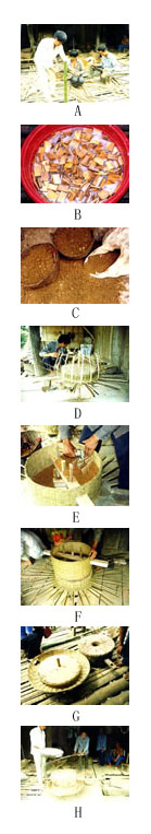 磨谷机竹料的选择。选生长多年无虫蛀无病状的竹木数根,经烈日暴晒后将其破开修成制作磨谷机用的各种竹蔑和竹片。