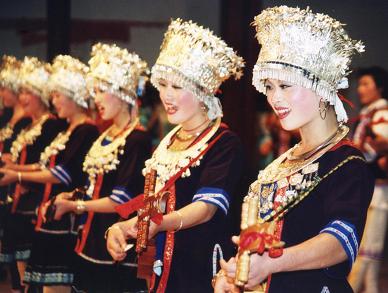 是台江施洞苗族姑娘,全身披挂银饰,她们同时戴数个链式银项圈和片饰项圈,胸前戴重大银锁,手腕戴着几对不同样式的银手镯。她们是苗族中佩戴银饰最多的一支。