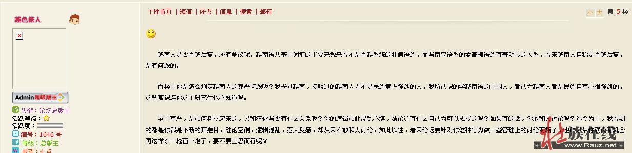 请管理员重新定位下《谈天说地》板块,到底什么叫“谈天说地”?“Mwngz hauq gou coenz 自由探讨,畅所欲言”到底能兑现不?人家发帖讨论发工资,讨论考古,讨论艾滋病都可以,难道对我发帖子说说壮族问题就要耿耿于怀,要设法加以处罚了吗?