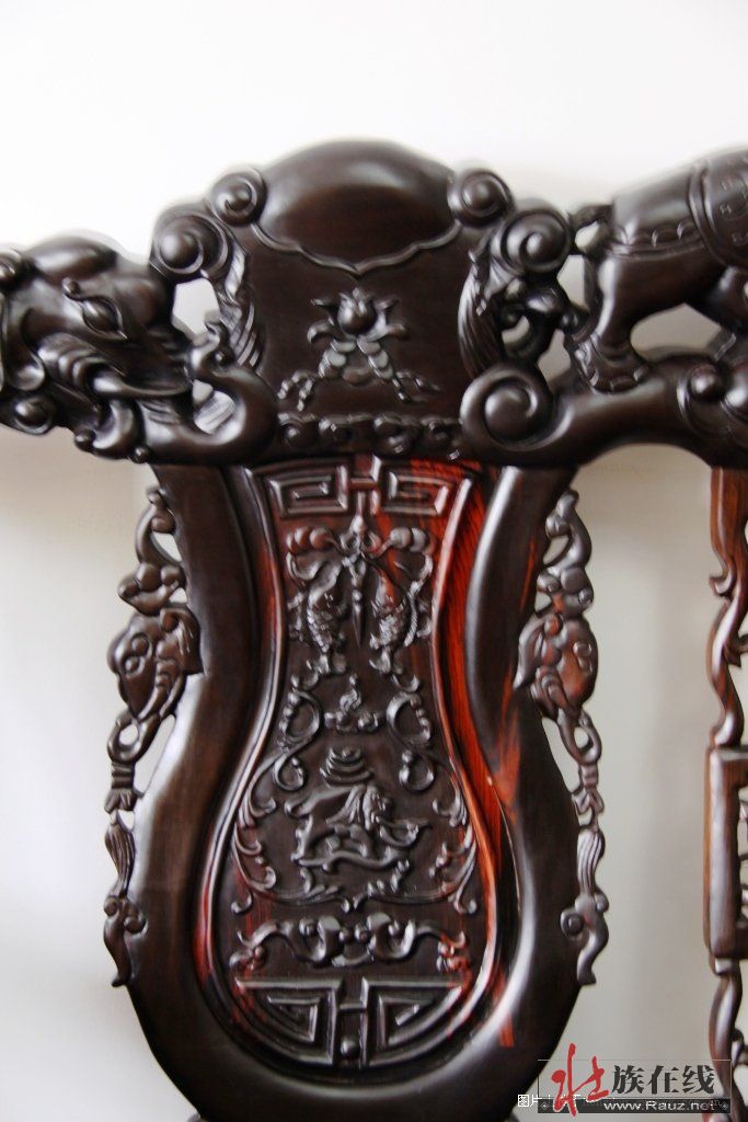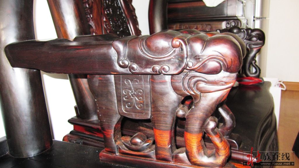 沙发靠背上雕刻有“吉象呈宝”图案,代表吉祥如意。
