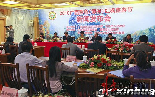 10月29日,2010广西百色(德保)红枫旅游节新闻发布会在南宁举行。新闻发布会上,百色市政府副市长赵桂兰及德保县政府县长牙韩高分别介绍了红枫旅游节的筹备情况及德保县旅游资源情况。