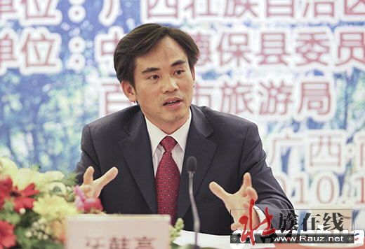 德保县政府牙韩高县长在新闻发布会上介绍德保的旅游资源。