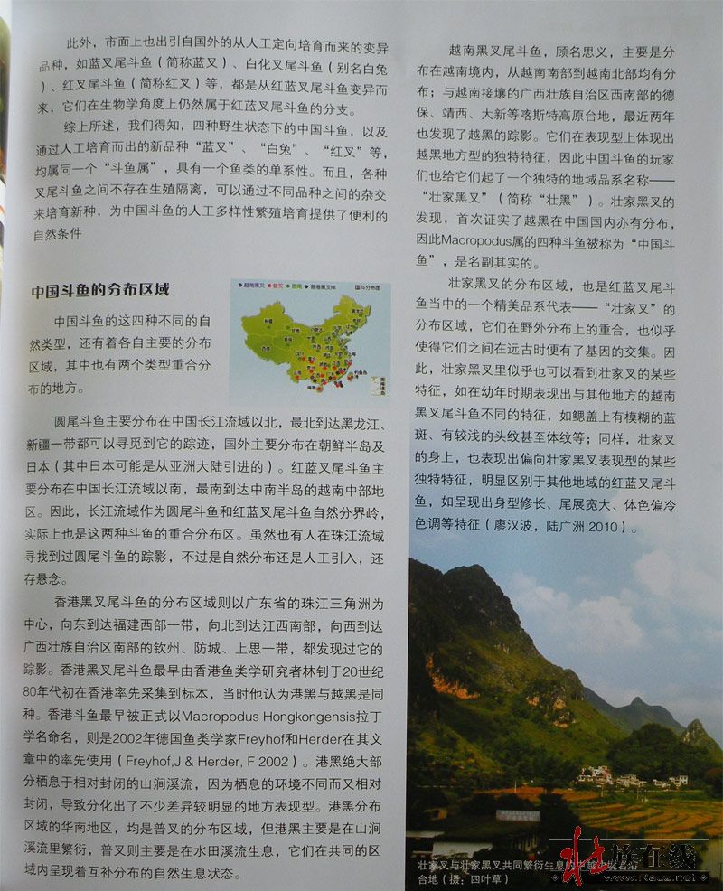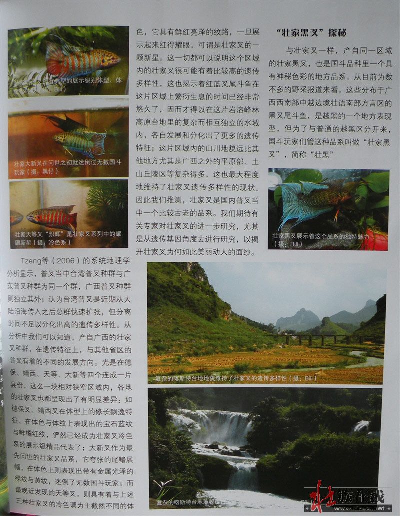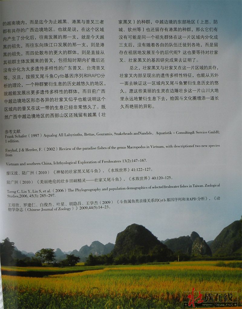 陆广洲(2010〈美丽绝伦的壮乡田峒精灵——壮家叉尾斗鱼〉,《水族世界》40:120-125