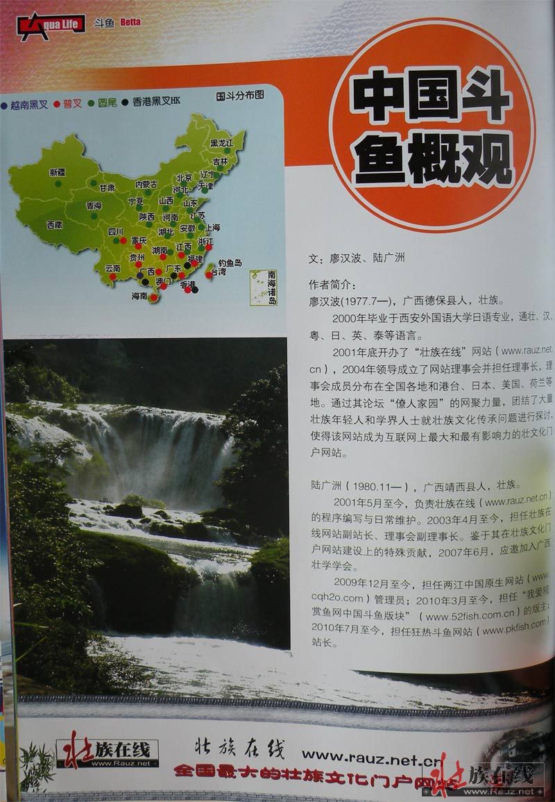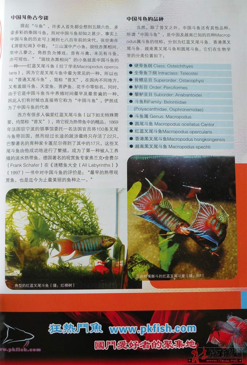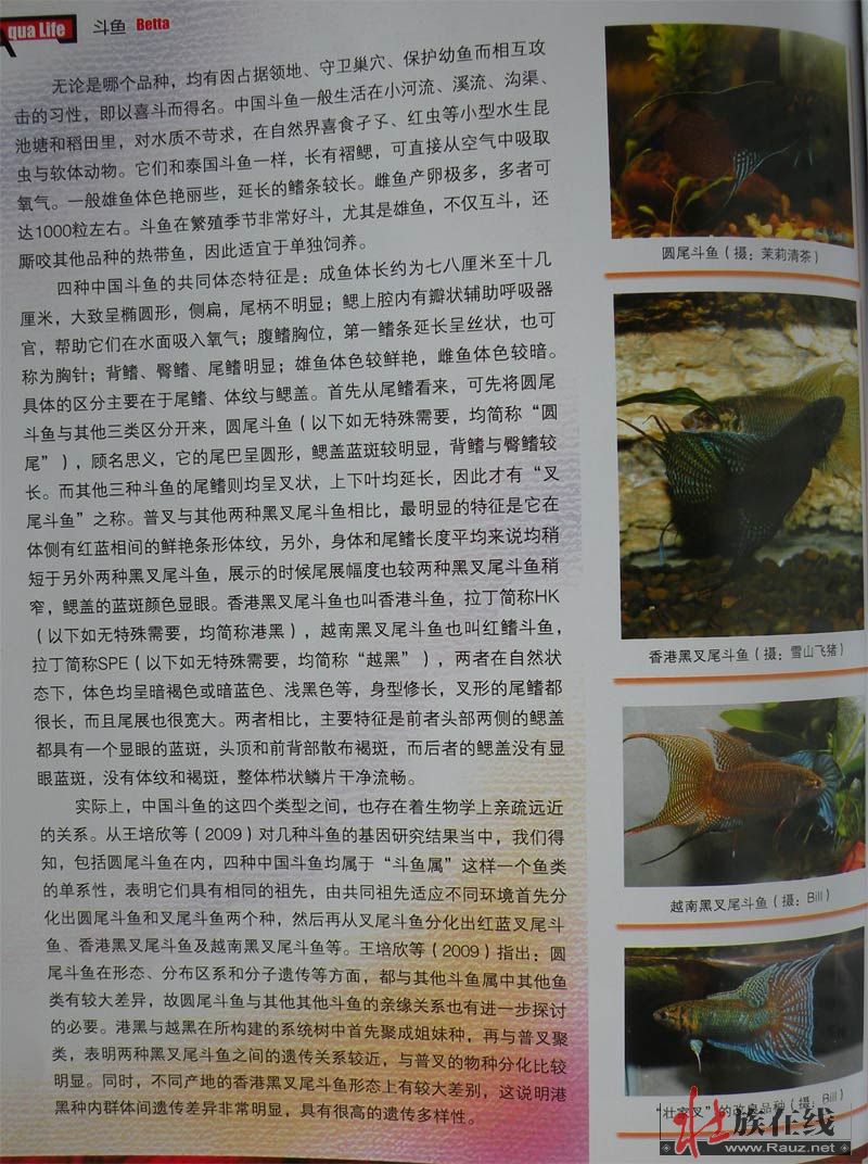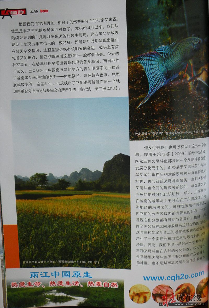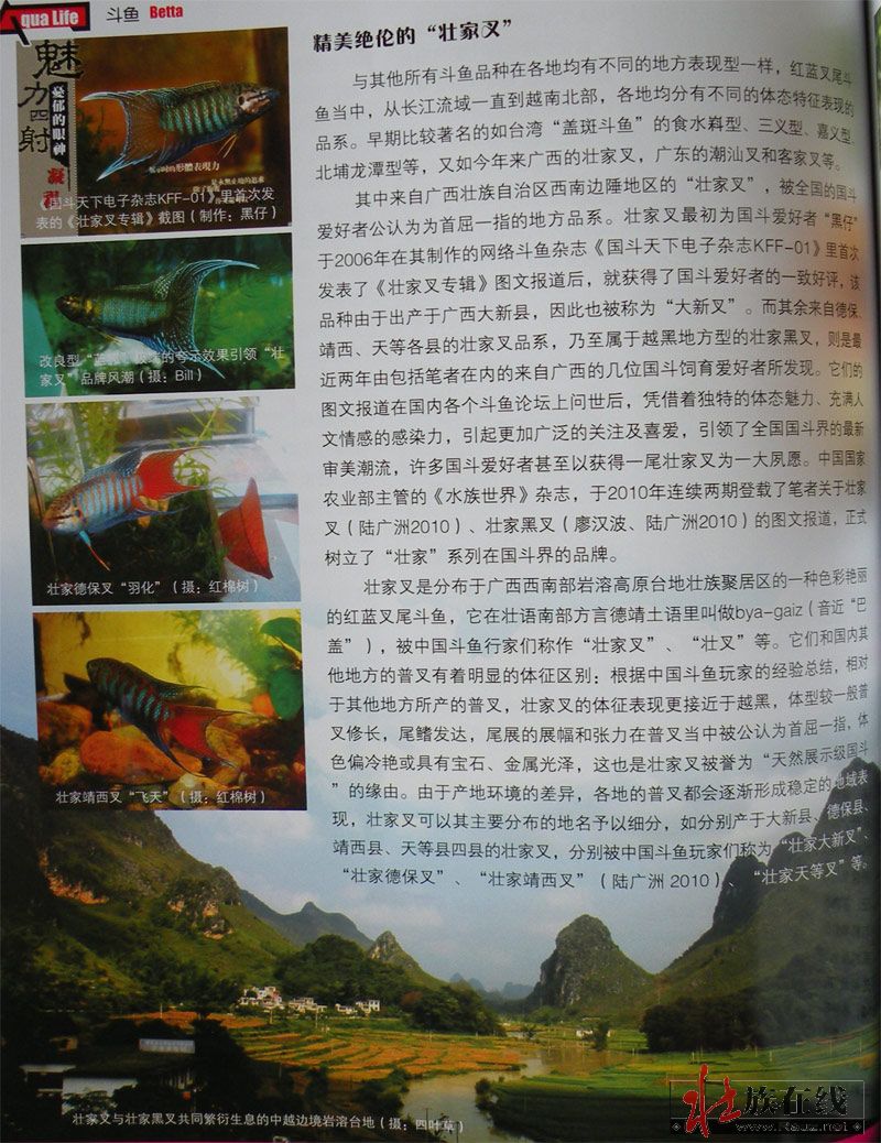 《水族生活》第28期首次以“中国斗鱼”为主题封面并刊登了标题为“中国斗鱼概观”的文章,特此向壮家叉爱好者和贝侬们推荐。本文由红棉树和我联合执笔,杂志虽完整刊登了文章内容,但在排版细节上存在一些问题,如文章中“生物学里的分类位置”从属的缩进,原稿里缩进使从属关系比较直观,而印刷的排版容易使读者误会“圆尾斗鱼”下还分“红蓝叉尾斗鱼”、“香港黑叉尾斗鱼”和“越南黑叉尾斗鱼”。另外在拉丁学名的印刷上应规范的采用斜体。