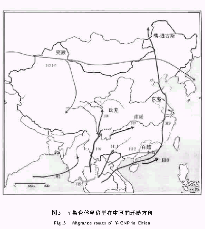 金力教授通过对东亚人群包括中国人群的大规模研究,不仅得出了各Y染色体单倍型在地域上的分布,更进一步总结了各单倍型在中国的迁徙路线.在研究过程中,我们也发现这个迁徙路线的正确性和实用性.我们的研究结果都基本符合这个路线.但对某些单倍型、在某些地区的迁徙路线还不是十分明确.如图3所示.这都有待于将来的研究来解决.从而完善用Y染色体SNP方法研究人类起源和迁徙的方法.
