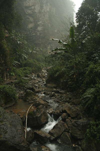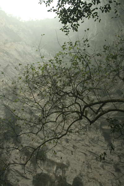 3月5日,早7:00,我从闹铃声中惊醒,赶忙起床洗刷完毕,早早来到酒店门口守侯他们,由于预先料到早上会有雾的天气,所以他们也懒懒散散地起床,一直接近9点才向五龙进发.由于云雾大,只看到路两边近距离的油菜花,所以没有拍到什么!!大约过了20分钟,我们是入进入五龙地界,从324国道转入4级省道.沿着宛然曲折的公路一直下,路的两边树木葱葱,叠叠翠翠,进入绿的海洋!!大约过了一个小时,路的两边的排排芭蕉树接幢而来,这时我才意识到五龙热区已经到,也就是我们已经从海拔1800多米的县城下到只有600多米海拔的五龙.突然一个大转弯,路边的一块巨石上刻着“凤凰谷”三个大字是那么醒目.