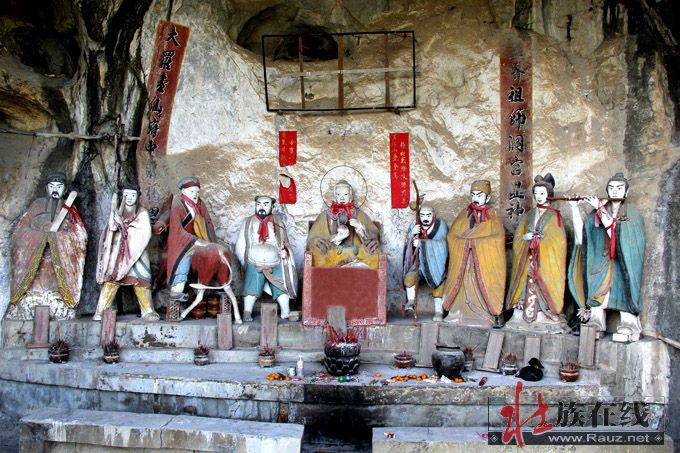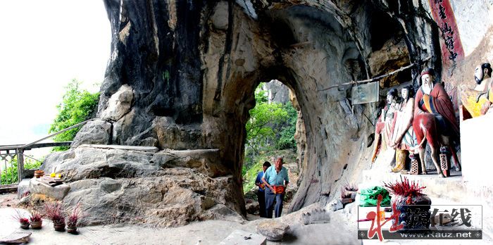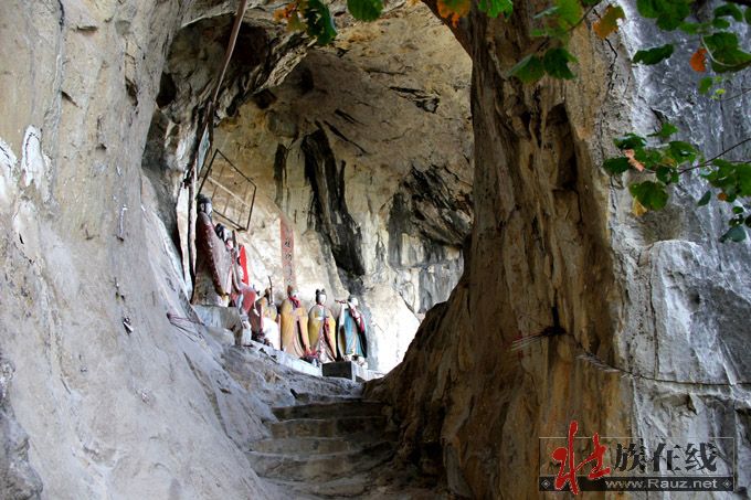 罗仙岩处于甘圩村西北面的玉屏山上(土名叫岜敢山),附近的村民叫敢留仙,即罗仙洞府。此山山体高峻平顶、方正如屏,山势巍峨、峭拔雄奇。从伏罗屯向西望,罗仙山像似一座佛头像照看众里乡亲,可谓是大小甘村的青龙卫士。罗仙洞府就坐落在玉屏半山腰,风景优美的天然洞中,古今小有名气。据当地群众介绍,罗仙岩清代《武缘图经》有记载:玉屏山山腹有洞曰芦仙,宽阔坦平,有两石柱对峙,成为左右两洞相通的天然门户。洞门椭圆形,宽敞明亮,洞壁平滑。有石礅数礅平面可坐卧,通过石门便到留仙洞府,主洞口半月形,宽深大于右洞,有天然台阶,台上安放太上老君及八仙塑像。神仙神态栩栩如生,仙容和蔼慈祥,世人称之为“留仙洞府”,恰如其实,真乃一方之胜地也。