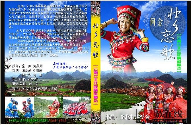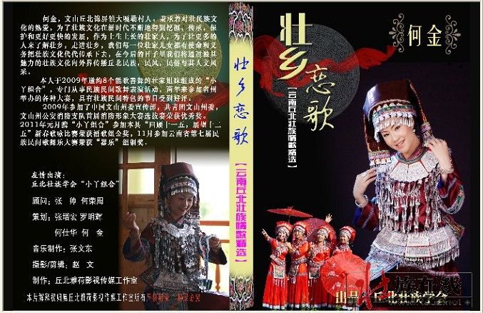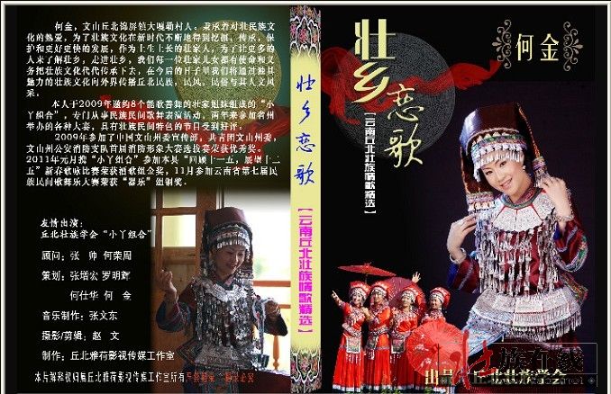 云南文山壮族情歌系列《壮乡恋歌》个人专辑已正式成品问世,本专辑由作者本人经过多年对壮族文化的挖掘,收藏,整理,改编加之一部分原创作品汇聚而成!整张专辑汇集了丘北所有壮族民歌文化精华,承载着壮乡儿女天籁欢歌,是一个壮族情歌珍藏版。