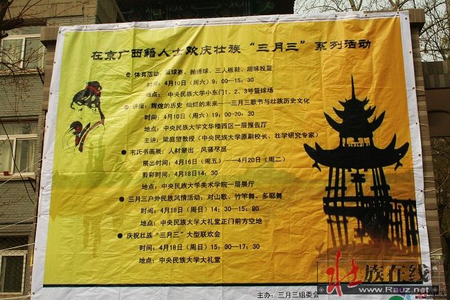 2.这次活动主要场地在北京中央民族大学,活动的各项具体实施工作由中央民族大学三月三文化研究会承担,该会主要成员是中央民族大学广西籍大学生,他们牺牲了许多休息、休闲甚至学习时间来做好这些工作。本贴文稿、图片也是由中央民族大学三月三文化研究会提供。