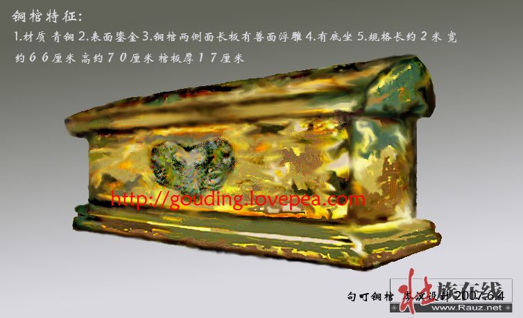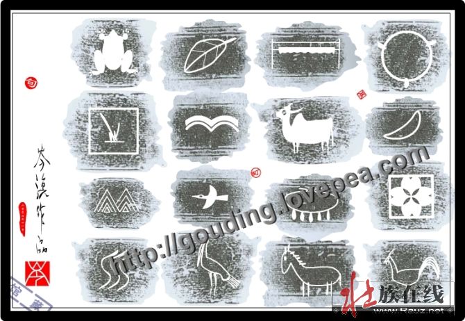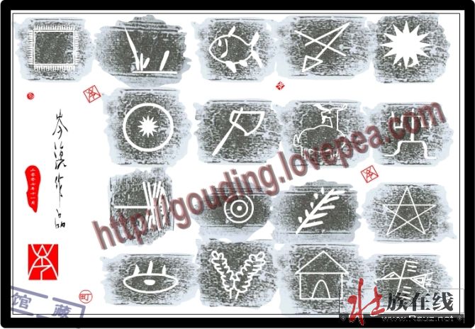 壮族铜鼓纹案,内容丰富、图案别致、花纹精美,常见的有方格纹、""字纹、水波纹、云纹、回字纹、编织纹、同心圆纹以及各种花草和动物图像,内涵意义:宇宙是由天、地、水三种物质构成的,“天轻天在上,地重地在下,水在天地间”;“三堺三王制”,意即:“宇宙分三界”,上界是天空,中界是陆地,下界是海洋,三界既独立又互相依存;还讲:创世神布洛陀使万物分成“都博”(公的)和“都咪”(母的),只有公母结合才能生成世界。先民们按照这一意识制作的铜鼓,鼓面正圆,代表天(上界),天的中心是“塔稳”(太阳纹),代表日神,天空还绘有身为“越祝之祖”的“骆”(飞鸟),鼓边纹饰为能向天神传递人间信息的“嘎”(青蛙);鼓身代表地(中界),是人和各种动物居住的地方,通常绘有羽人、牛马、干栏建筑及各种图案,特别突出“洛莫”(剽牛祭神)及“介泐”(划船竞渡)等习俗;鼓足代表水(下界),是水族居住的地方,通常绘有波浪纹和水生物图案。壮族先民在制作铜鼓时还特别注意其音响,并按声音高低来区分公母,意在使公母互相感应,促进万物生息繁衍。