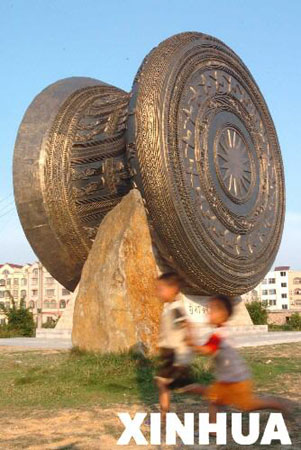 位于广西百色市火车站进站大道广场的世界最大的铜鼓雕塑“句町铜鼓”