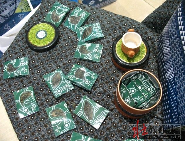 个包装——茶包。采用镂空形式,可看见茶叶,图案为灵山型的鸟纹。