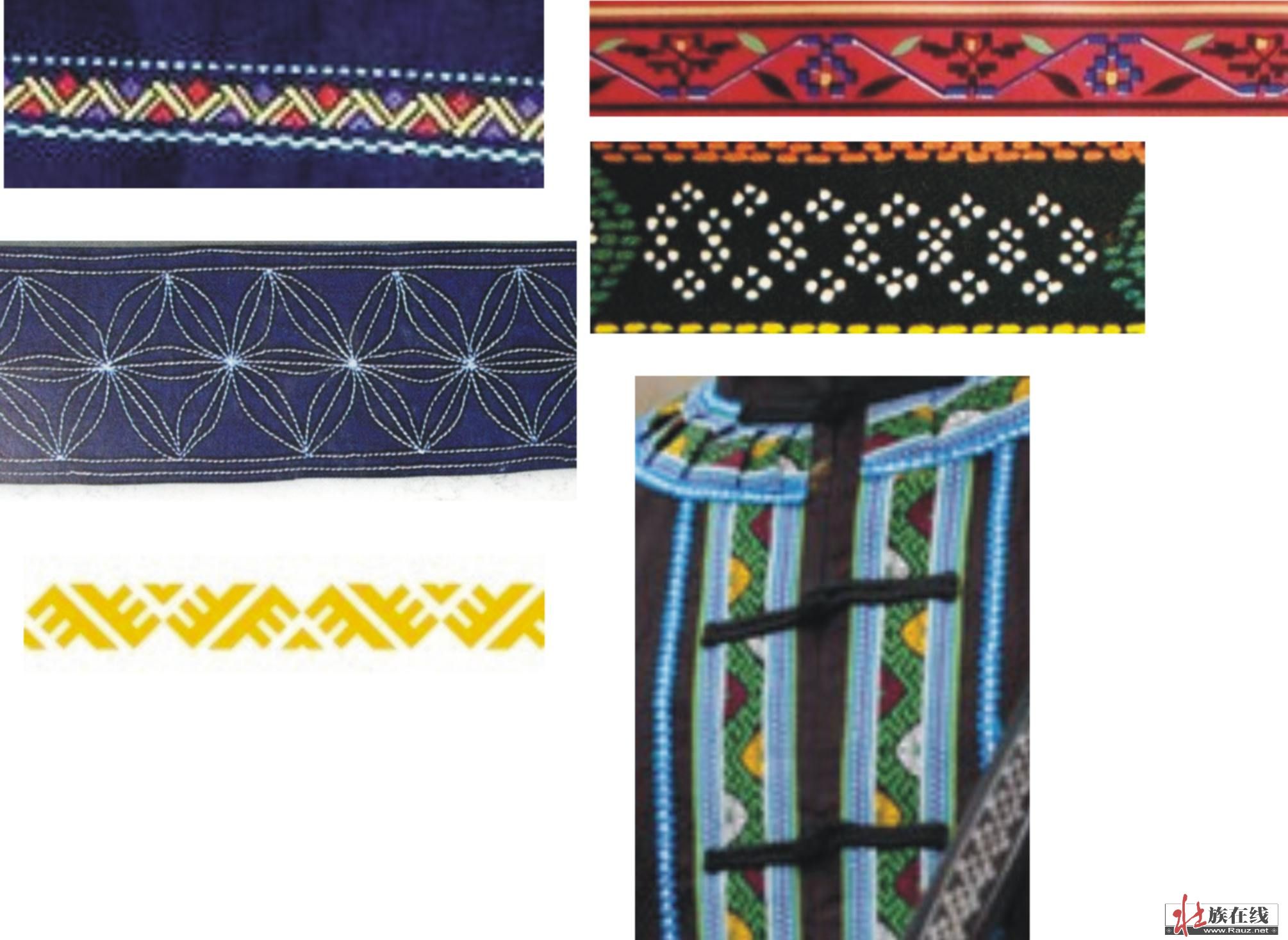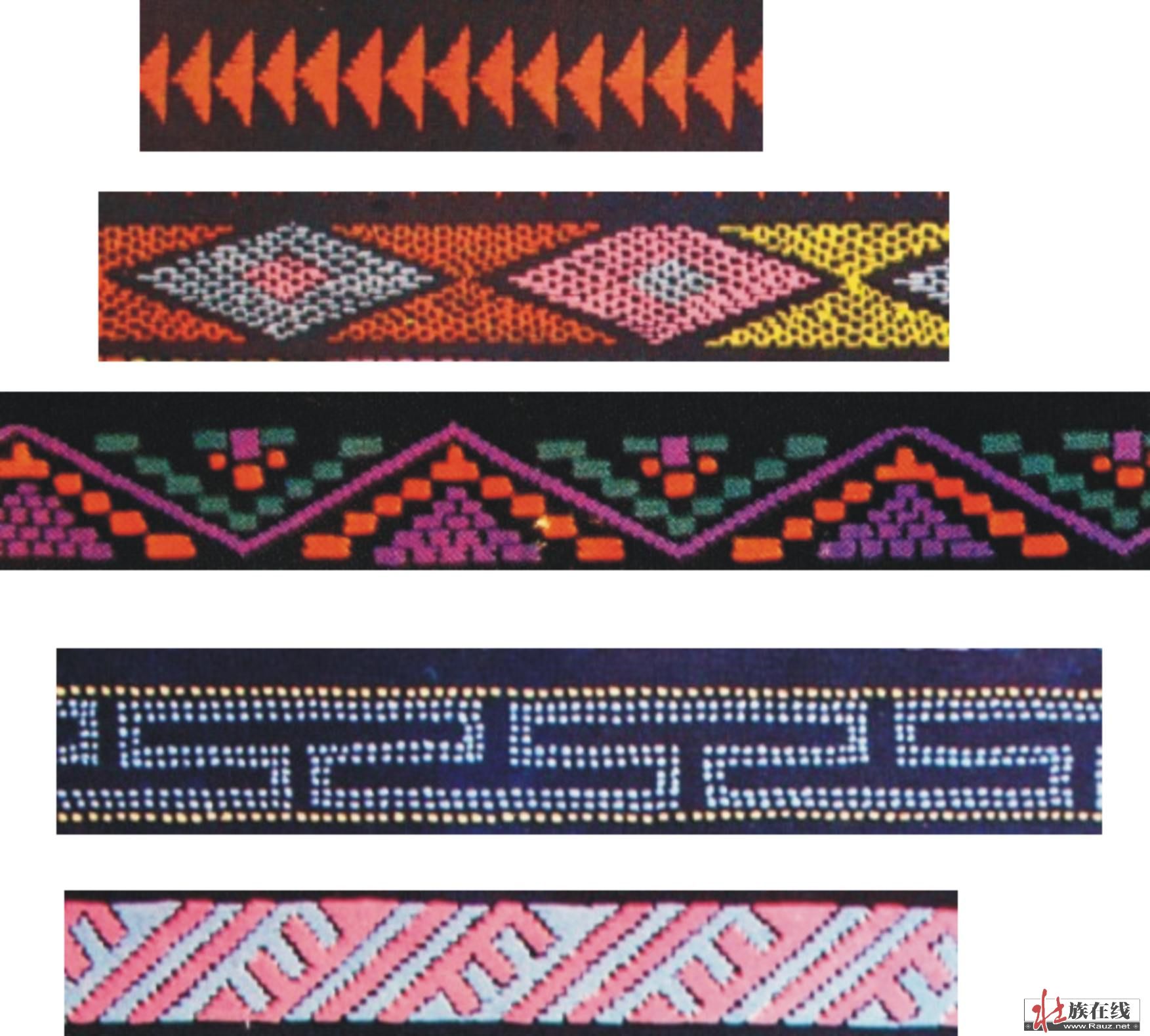 8、根据隆林布衣壮中对衣袖口纹样的描述:以不同颜色的波浪比喻江河,以不同形状的线条比喻小船,以三角形的图案比喻新建的家园,大胆而超现实的想象。
