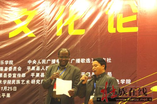 11月25日,主持人邀请Adams Bodomo(博艾敦)教授在论坛上放歌一首,他愉快地接受了。当这位黑人教授走上会场讲台时,掌声便四处响起。他拿着话筒,用英语说到:“我来自遥远的非洲加纳,今天来到平果县参加歌圩文化论坛,非常高兴。下面我给大家演唱一首壮族山歌叫《我从非洲到壮乡》,不过,我有个小小的要求,我邀请我的一位朋友——覃先生和我一起唱,好吗?”,接着,他叫道:“覃先生,请上台来!”此时,只见一位中等身材的汉子从台下走上讲台,他是广西《三月三》杂志社的总编辑覃祥周。两人轻声细语两句之后,便用壮语放声高歌: