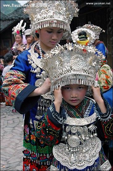 南花苗寨。离凯里市不远的一个景点。苗寨门口的停车场,散发着零星的汽车废气。早上的阳光透擦过屋檐,形成一道道的光柱,沐浴着潮湿的、窄窄的石板路。挑着箩框的寨民、嘻哈着的小孩、懒洋洋的看门猫,若隐若现在此美妙的光线之中。我们远离城市的熙囔,为首次抱起满身银饰的苗族小孩、甚至穿上苗族服装而感到兴奋!还误以为,拍到走过那些穿上了苗族服饰的人们,只是一个偶然的机会……南花苗寨小山坡上的芦笙堂是民族歌舞表演的地方,当地人用舞蹈为寨子带来旅游经济收益。给小孩子拍照的时候,从他们都高举的“V”字形手势的举止中,似乎感受到一种蜕变…… 苗族妹妹头上的银冠,光辉四射。其服饰、银饰上的花纹、图案的内涵和艺术,使我很有兴趣慢慢研究。只是看到她涂上的嘴红,似乎是旅游开发后的腐朽产物。穿过她的眼神,让我感受到的是一种背后的无奈。
