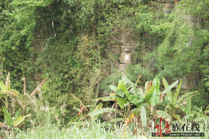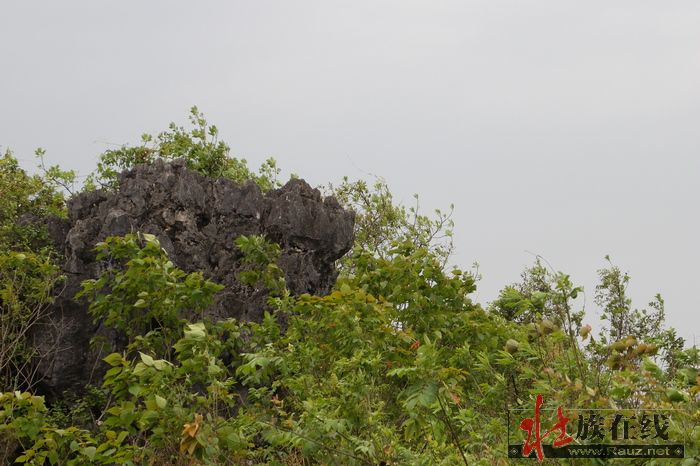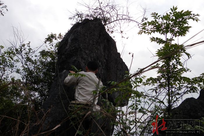 就是这个岩石,在山的最顶上,它搁在另外的三块岩石上,半掩于绿叶中。下部几块岩石相接的地方有缝进去。