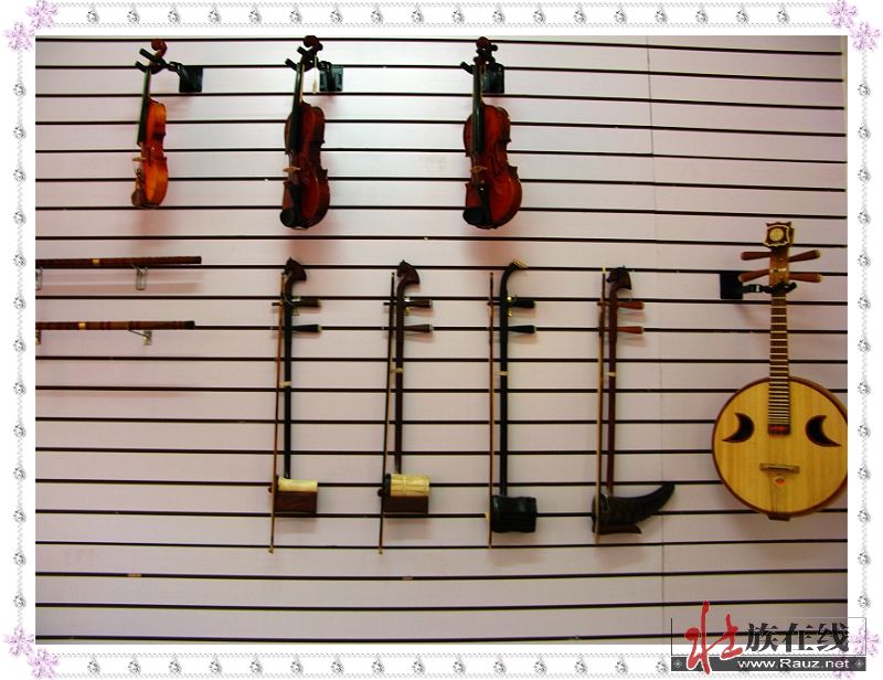 黄广扩先生亲手制作的马骨胡、二胡和牛角胡成为了琴行里一道独特的壮族民族乐器风景线。