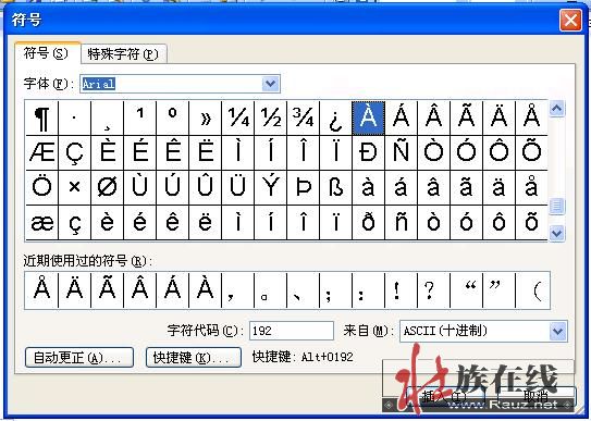 编码可以在word里面获得:依序打开[插入]-[符号],如下图所示,À的字符代码是192,因此,以后再要输入它,不用再去慢慢打开选项来插入特殊字符了,只要输入Alt+0192就可以了.