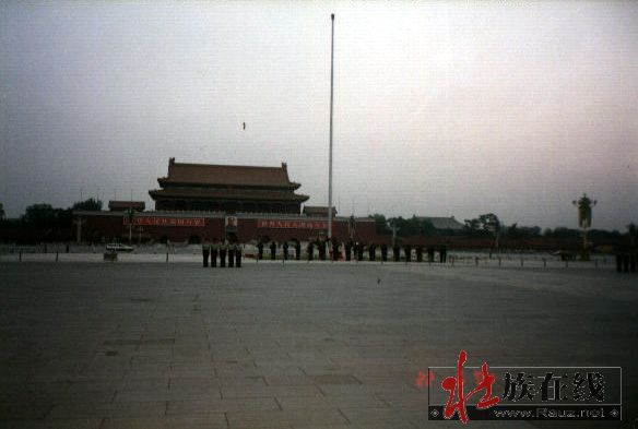 为了亲眼目睹升旗仪式,早上3点就起床去天安门广场。去得太早了,广场不给进,只好在人民大会堂边的大树下等,快到5点时可以进了,箭一样地冲进去,占到了第一排正中的位置,在感受升旗仪式威严的同时,照下这张照片。