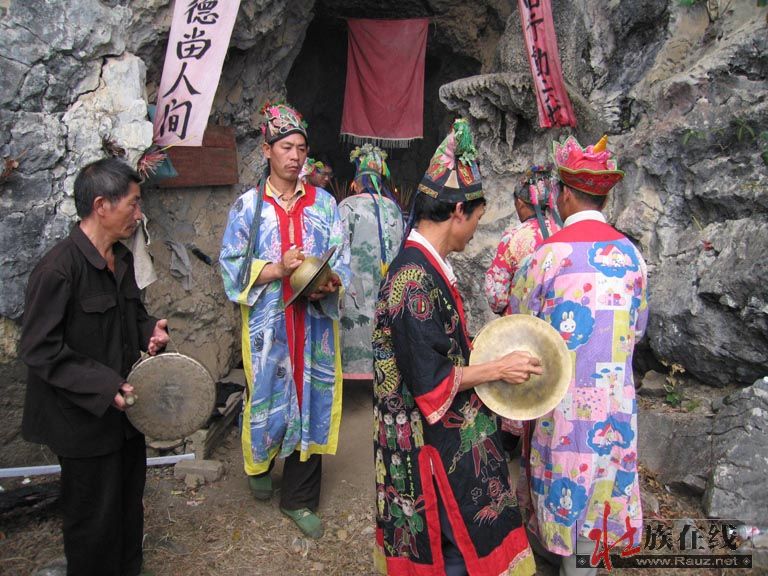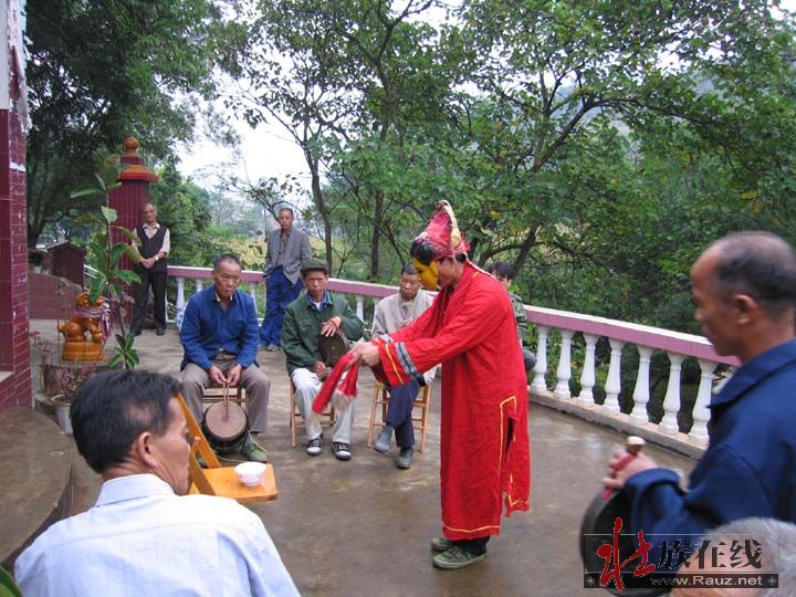上图17:上林县塘红乡仙岩山天地庙前道公为考察组做的民俗表演。道教是后来才传人壮区的中原汉族创立的宗教;时至今日壮民仍不肯下山建观,和谐的将道教的元素与壮区最原始的岩洞崇拜信仰融合在一起。