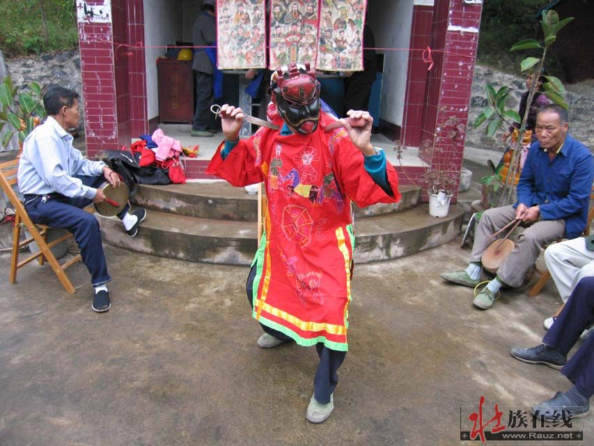 上图19:师公在上林县西燕街的庙宇前做当地民俗表演《求雨》,内容与“乜特掘”求雨的功能有相似之处。