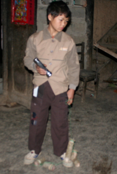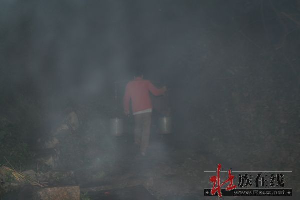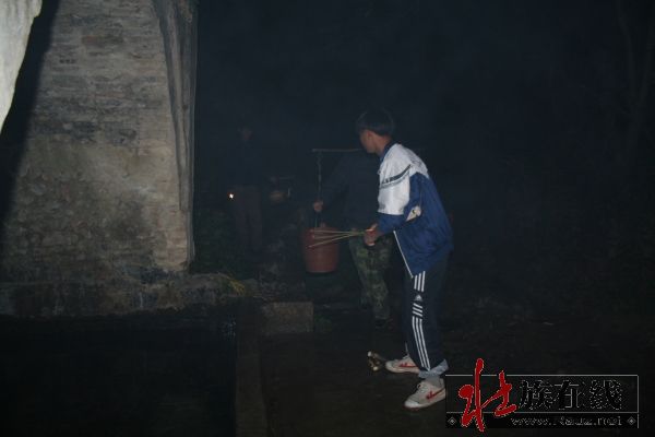 大年初一,"呜 呜........"的铜鼓声把我从梦中惊醒!!这是光家(族长)传来叫醒声,大年初一凌晨三四点,光家都或击铜鼓或击锣把族人叫醒!准备招牛魂!顷刻间,"咯落 咯落 咯落........"(意祝牛儿旺起来,发起来!!)从村里的每个角落响起!! 招牛魂开始了,我连忙起床出来,我二哥和侄 儿早已起来等我,我二哥挑着水桶,手里拿着已点好的香! 侄儿子手里牵着用木头做"的膜",是用来招牛魂的,"的墨"一般是作成单的,可以旺起来,如果作成双则旺不起来!! 我连忙拿着DV机和照相机跟随他们!我边拍边叫着"咯落 咯落.......",很是过瘾!!!!