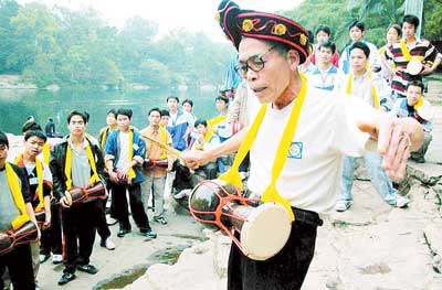 歌舞表演用的鼓是用陶器制作的,很多人一定会瞪大双眼——有这回事?2005年广西武鸣举办的壮乡“三月三”歌圩上,一组由壮家少年表演师公“横鼓舞”技惊四座。