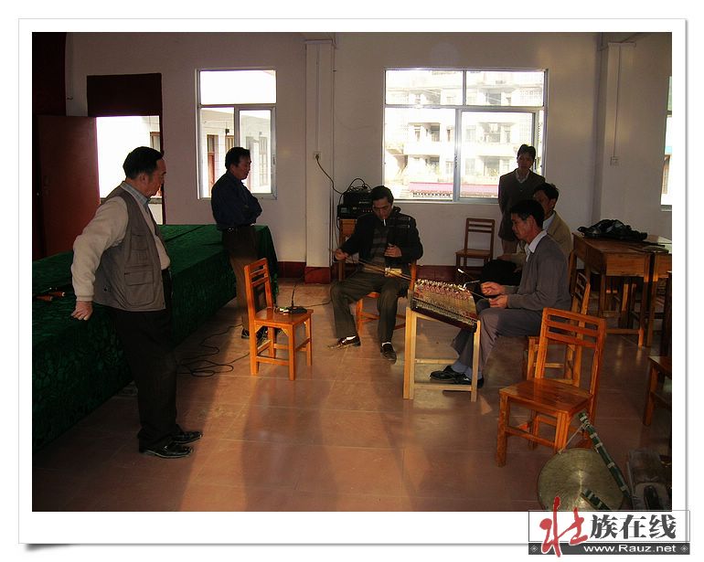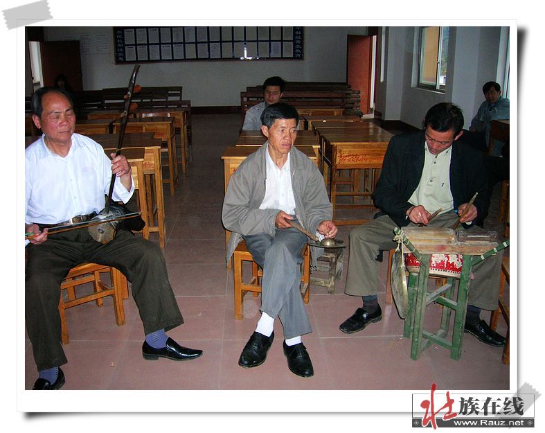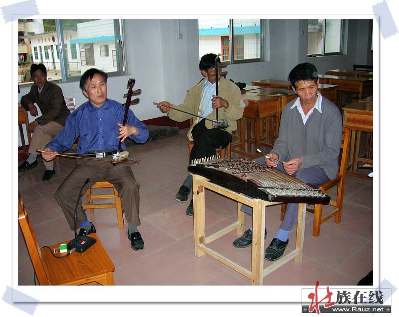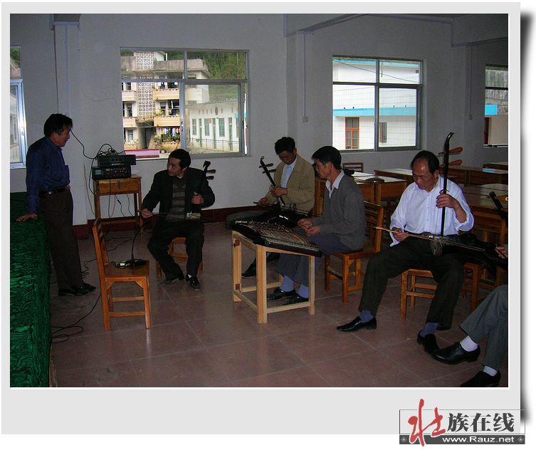都安乡壮剧艺人们分别演奏马骨胡、扬琴、二胡